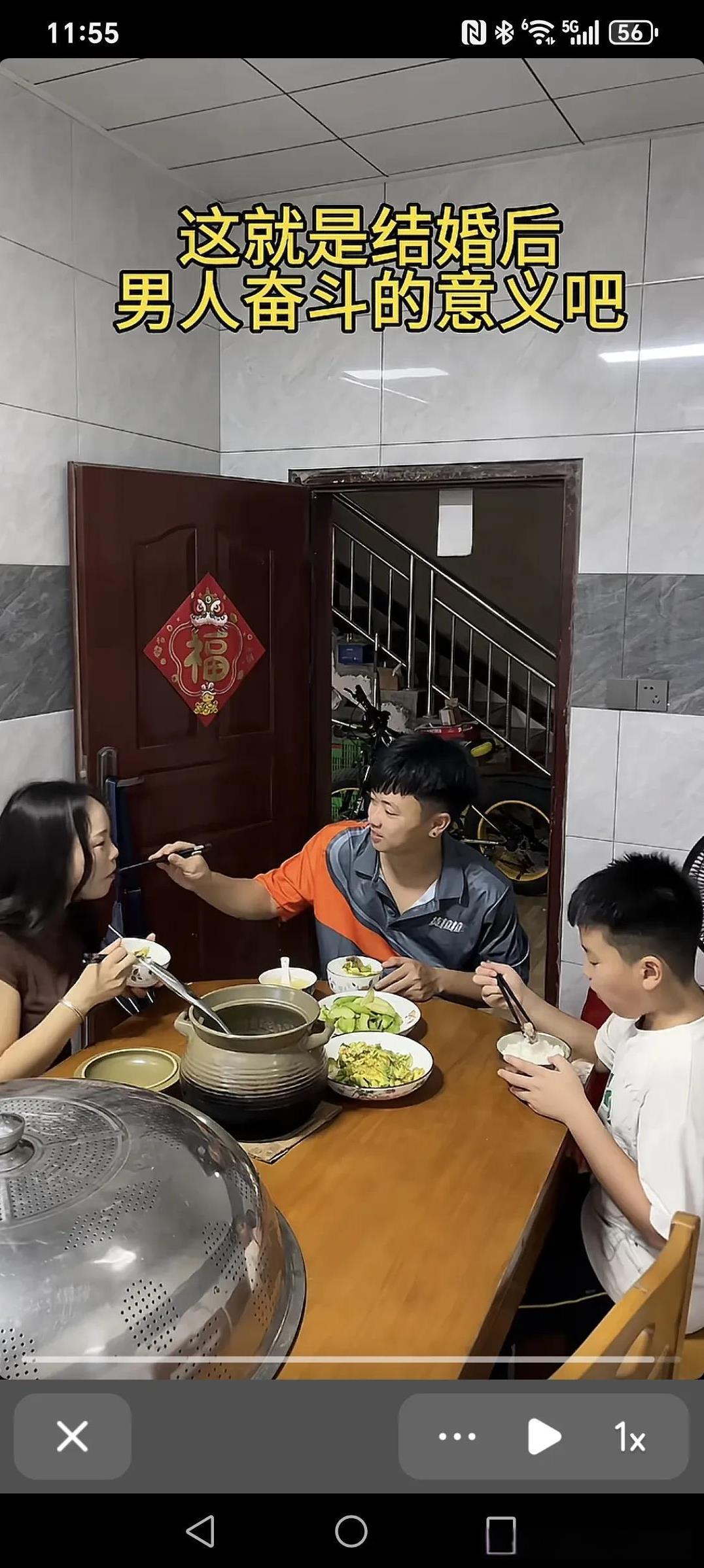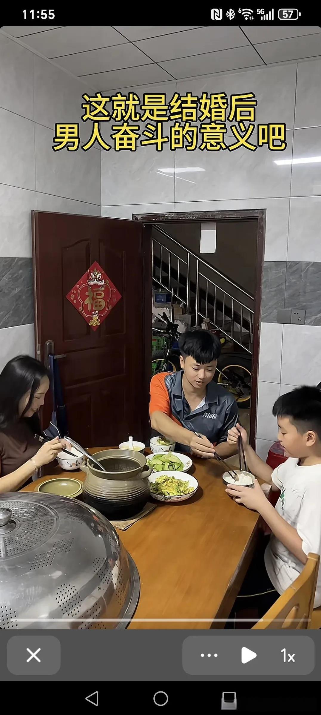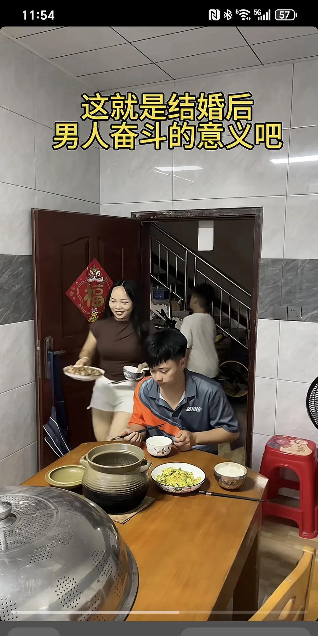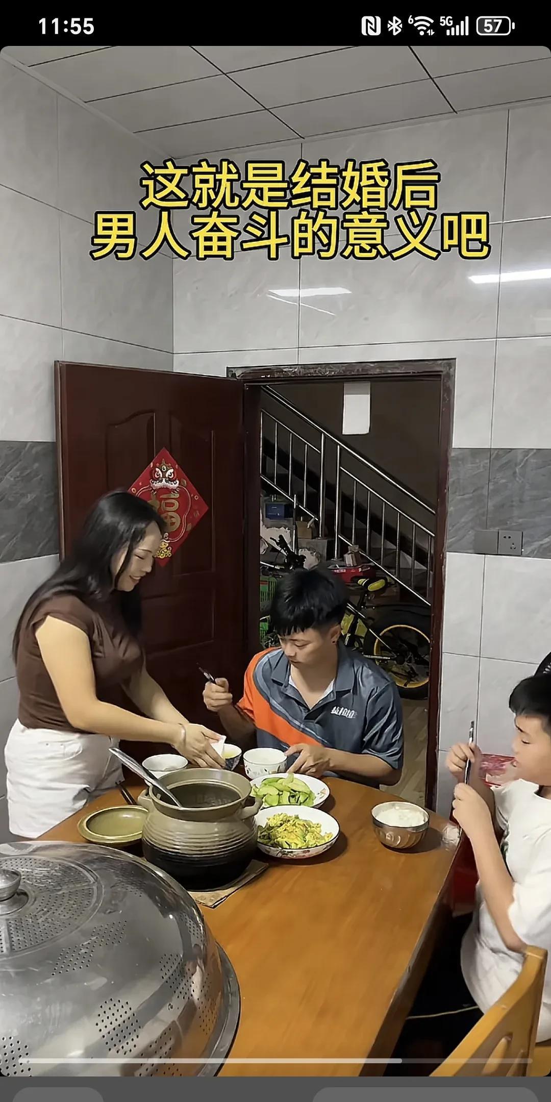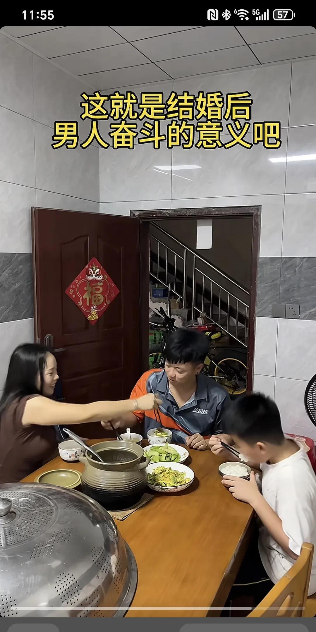 这就是结婚后,男人奋斗的意义吧~ 老公带着一身的疲惫到家,回到家发现一个人都没有,饭菜也没有...这时老婆,儿子端上来饭莱,老婆给老公盛汤夹菜,老公给儿子给老婆夹菜,吃饭氛围显得其乐融融,也许这就是一个男人奋斗的意义吧。 家庭是双向奔赴的,和睦的家庭都会越来越好! 男人就是这样,无论多苦多累,即使没有一分钱是为自己挣的,甚至负债累累,遍体鳞伤,都无所谓,没有依靠也无从来没怕过,最怕的是不被理解。