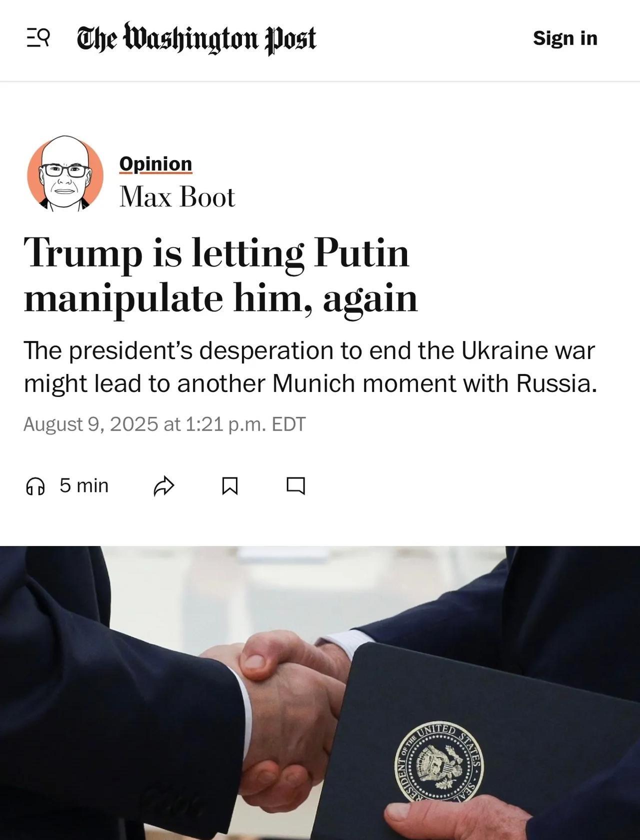 WP《华盛顿邮报》:如果川普同意普京的条件(放弃顿巴斯和其他土地),这将是1938年失败的《慕尼黑协定》的重演——该协定曾一度允许纳粹德国吞并整个捷克斯洛伐克,为第二次世界大战奠定了基础。 根据《慕尼黑协定》,英国首相张伯伦在未与捷克协商的情况下,将苏台德地区(当时捷克斯洛伐克境内戒备森严、防守严密的地区)移交给希特勒。作为回报,张伯伦只得到了「我们时代的和平」的空洞承诺。 《华盛顿邮报》的结论是,目前看来,普京只是想在谈判桌上实现他的军队在地面上无法实现的目标——在 10 年内占领顿巴斯。 普京正试图避免制裁,并就他在前线未能赢得的东西——顿巴斯的控制权——进行谈判。 川普匆匆前往阿拉斯加与普京会面,并有可能再次成为克里姆林宫领导人操纵的受害者。 如果他真的想获得诺贝尔和平奖,就应该宣布对俄罗斯实施新的大规模制裁,将冻结的俄罗斯资产转移到基辅,并大幅增加对乌克兰的武器供应。这些举措将迫使普京与他正面交锋,并为谈判奠定基础。 然而,川普却在浪费透过制裁威胁所获得的优势,任由侵略行为持续下去。 #俄乌战争# #俄乌冲突#