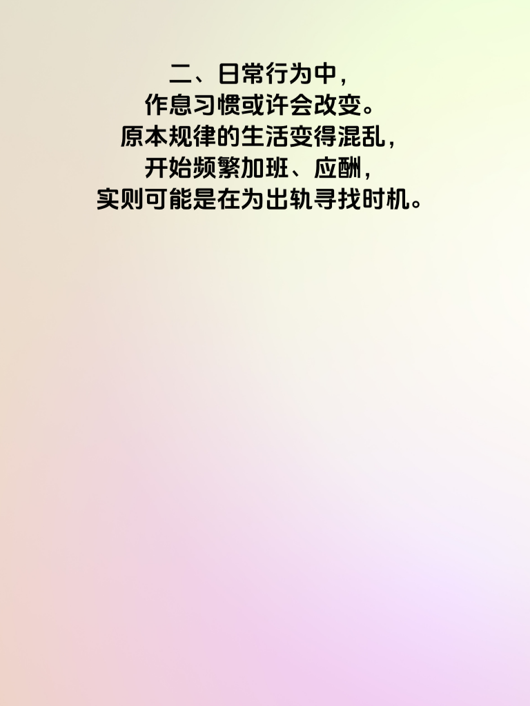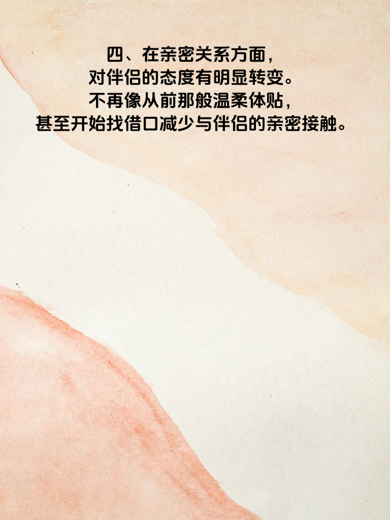 一、中年男性出轨前,身体往往会发出一些不易察觉却值得留意的信号。首先,在外表上,可能会突然注重形象,频繁购买新衣服,对穿着打扮比以往更上心。 二、日常行为中,作息习惯或许会改变。原本规律的生活变得混乱,开始频繁加班、应酬,实则可能是在为出轨寻找时机。 三、再者,身体语言也会泄露端倪。在家时变得坐立不安,不敢直视伴侣的眼睛,总是有意无意地避开眼神交流。 四、在亲密关系方面,对伴侣的态度有明显转变。不再像从前那般温柔体贴,甚至开始找借口减少与伴侣的亲密接触。 五、还有,情绪上也会出现波动。时而莫名烦躁,时而又异常沉默,这些情绪变化背后可能隐藏着出轨的心思。若你察觉到这些信号,一定要冷静观察,及时沟通,避免家庭陷入危机。