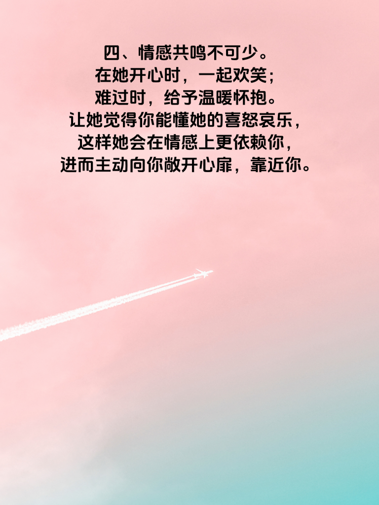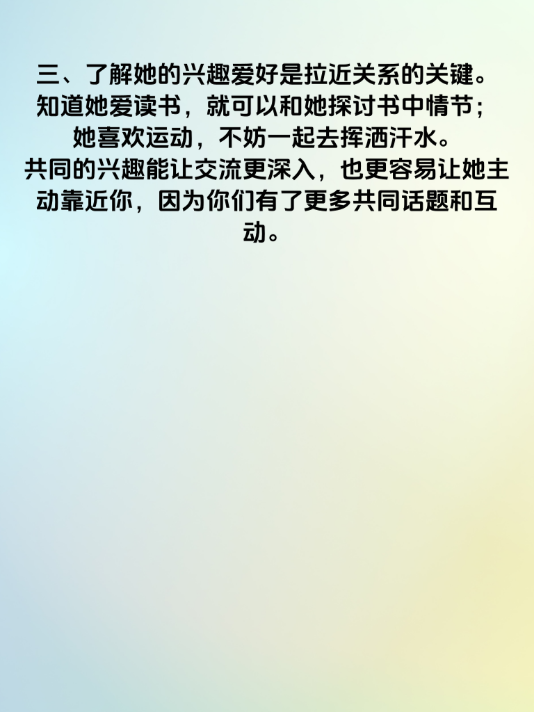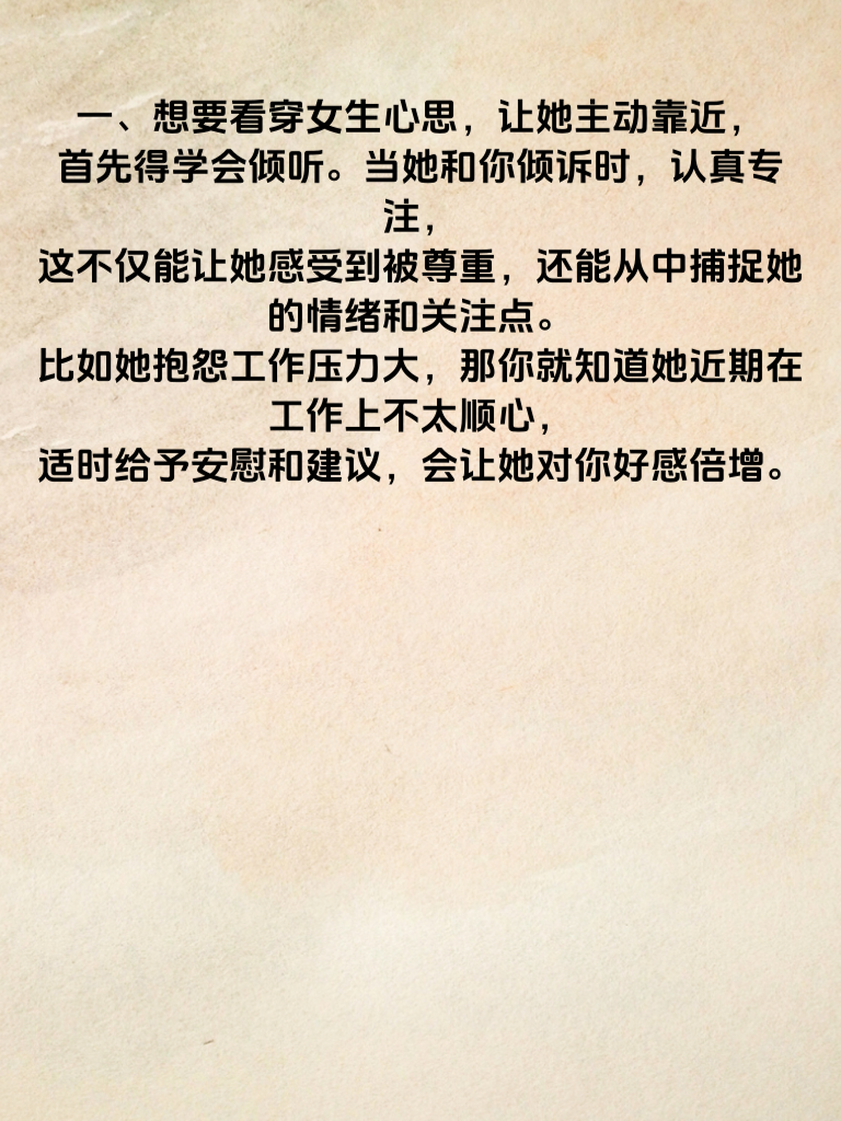 一、想要看穿女生心思,让她主动靠近,首先得学会倾听。当她和你倾诉时,认真专注,这不仅能让她感受到被尊重,还能从中捕捉她的情绪和关注点。比如她抱怨工作压力大,那你就知道她近期在工作上不太顺心,适时给予安慰和建议,会让她对你好感倍增。 二、观察细节也至关重要。她的穿着打扮、配饰选择,能透露她当下的喜好和心情。若她突然换了风格,可能是有新的审美追求。她的小动作、表情变化,更是内心想法的直观体现。微微皱眉或许是对某件事不太满意。 三、了解她的兴趣爱好是拉近关系的关键。知道她爱读书,就可以和她探讨书中情节;她喜欢运动,不妨一起去挥洒汗水。共同的兴趣能让交流更深入,也更容易让她主动靠近你,因为你们有了更多共同话题和互动。 四、情感共鸣不可少。在她开心时一起欢笑,难过时给予温暖怀抱。让她觉得你能懂她的喜怒哀乐,这样她会在情感上更依赖你,进而主动向你敞开心扉,靠近你。
