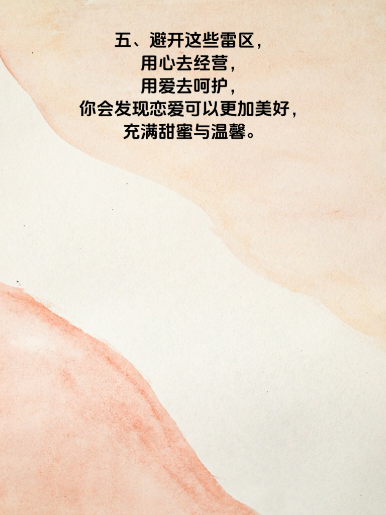 一、恋爱中,有些雷区一旦踏入,便可能让美好蒙上阴影。比如过度追问对方的过去,每个人都有自己的隐私和不愿提及的过往,逼得太紧只会引发反感。 二、还有总是无端猜疑,缺乏信任的感情脆弱不堪。要相信对方,给彼此足够的空间。 三、一味地指责批评也不可取。多些理解与包容,用鼓励代替指责,感情才能升温。 四、另外,忽略对方感受,只考虑自己也不行。多站在对方角度思考,才能让对方感受到你的爱意。 五、避开这些雷区,用心去经营,用爱去呵护,你会发现恋爱可以更加美好,充满甜蜜与温馨。
