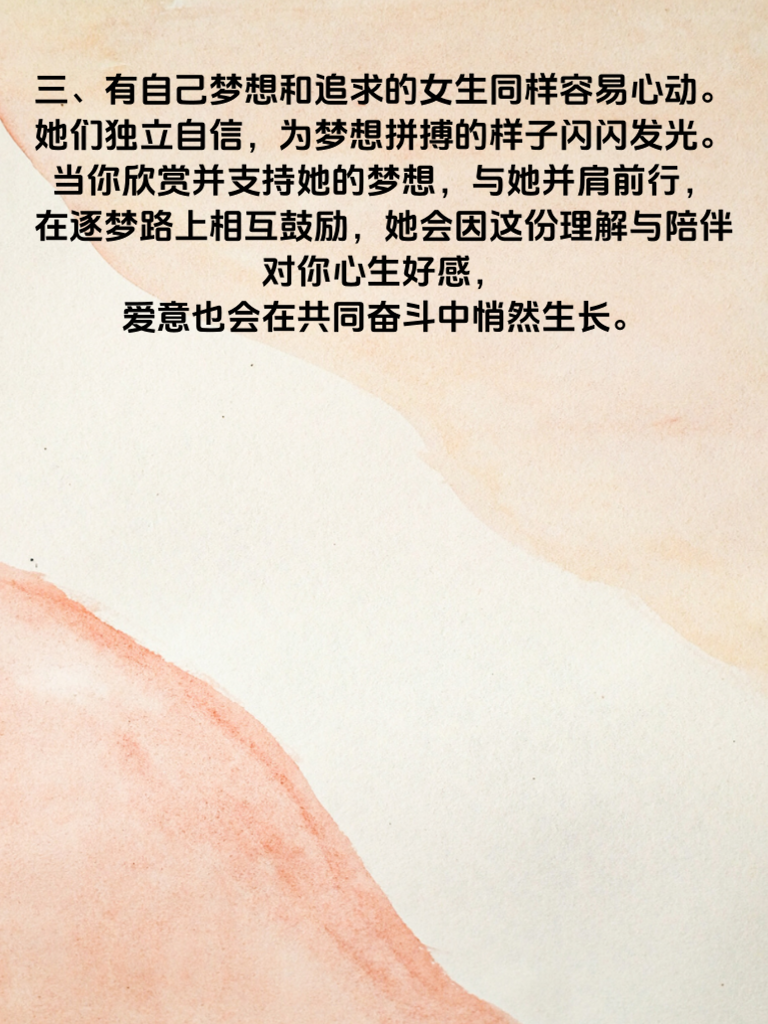 一、男人必知:这几类女生最易心生爱意。在追求女生的道路上,了解她们的心理至关重要。首先,善解人意的女生容易心动。她们总能设身处地为他人着想,能敏锐捕捉你的情绪变化,给予恰到好处的安慰与支持。当你疲惫时,她的轻声问候能暖人心扉;当你遇到困难,她会坚定地站在你身旁。 二、热爱生活的女生也较易心生爱意。她们对世界充满好奇,积极向上的生活态度极具感染力。无论是一次浪漫的日出,还是一顿精心准备的美食,她们都能从中发现美好。与她们相处,你会被这份热情带动,共同创造更多精彩瞬间,在点滴生活中滋生爱意。 三、有自己梦想和追求的女生同样容易心动。她们独立自信,为梦想拼搏的样子闪闪发光。当你欣赏并支持她的梦想,与她并肩前行,在逐梦路上相互鼓励,她会因这份理解与陪伴对你心生好感,爱意也会在共同奋斗中悄然生长。