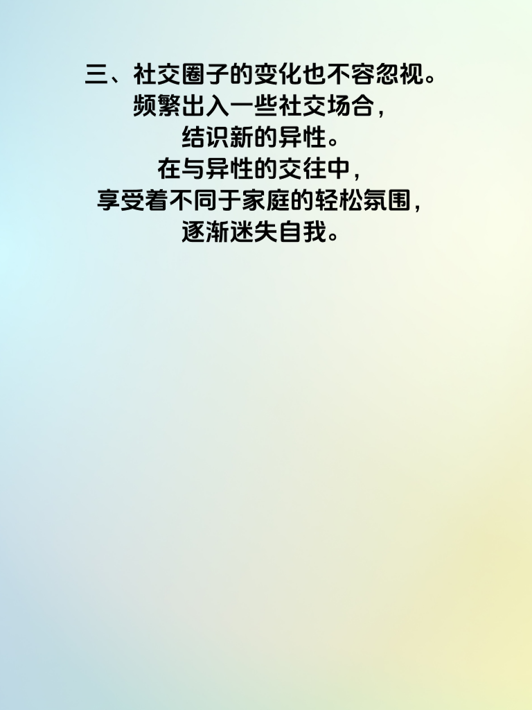 一、中年男人,生活的波澜易催生出轨的涟漪。事业的瓶颈、家庭的琐事,日复一日的平淡容易让他们心生厌倦。此时,若外界有一丝别样的温柔触动,便可能成为出轨的导火索。 二、他们的心理变化往往悄然开始。对伴侣的态度不再如往昔,变得冷漠或挑剔。开始注重自己的外表,渴望被关注,试图在他人身上找回逝去的青春活力。 三、社交圈子的变化也不容忽视。频繁出入一些社交场合,结识新的异性。在与异性的交往中,享受着不同于家庭的轻松氛围,逐渐迷失自我。 四、然而,出轨并非无解。伴侣间应重拾往日温情,多些理解与沟通。男人也要学会审视自己,明白家庭的珍贵。只有正视内心的渴望,才能避免陷入出轨的泥沼,守护住那份长久的情感。