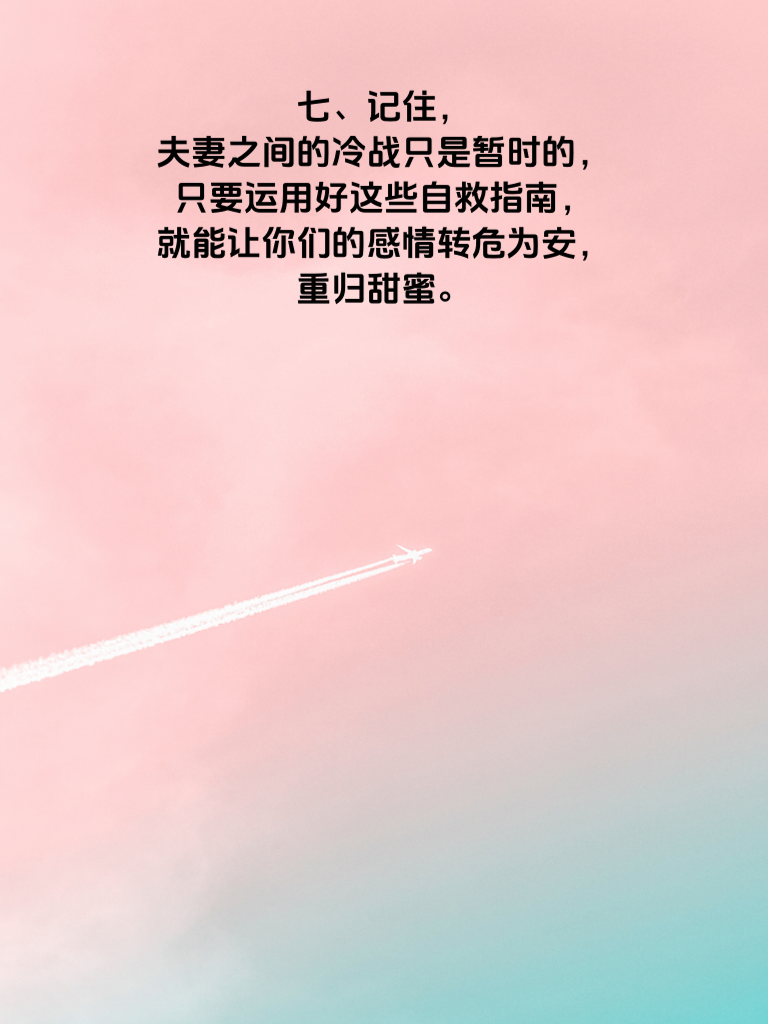一、夫妻冷战,就像一场没有硝烟的战争,弥漫着紧张与压抑。但别担心,这并非无解之局,我们有转危为安的自救指南。 二、首先,冷静是关键。冷战时情绪激动,此时先让自己冷静下来,才能理智思考。给彼此一些时间和空间,等双方都平静了,再去解决问题。 三、主动沟通很重要。不要总是等着对方先开口,主动迈出第一步,真诚地表达自己的感受和想法。比如:‘亲爱的,我觉得我们之前冷战,让我心里很不好受,我想和你好好聊聊。’ 四、倾听对方也不可少。当你表达完,也要耐心听对方的想法,不要急于反驳。也许对方也有很多委屈和心里话。 五、承认错误不丢人。如果是自己的问题,勇敢承认错误,真诚道歉。一句‘对不起,是我做得不好’,往往能化解很多矛盾。 六、制造小惊喜。冷战后,不妨送个小礼物,比如一束花、一份对方喜欢的小点心,打破僵局,让气氛重新温暖起来。 七、记住,夫妻之间的冷战只是暂时的,只要运用好这些自救指南,就能让你们的感情转危为安,重归甜蜜。