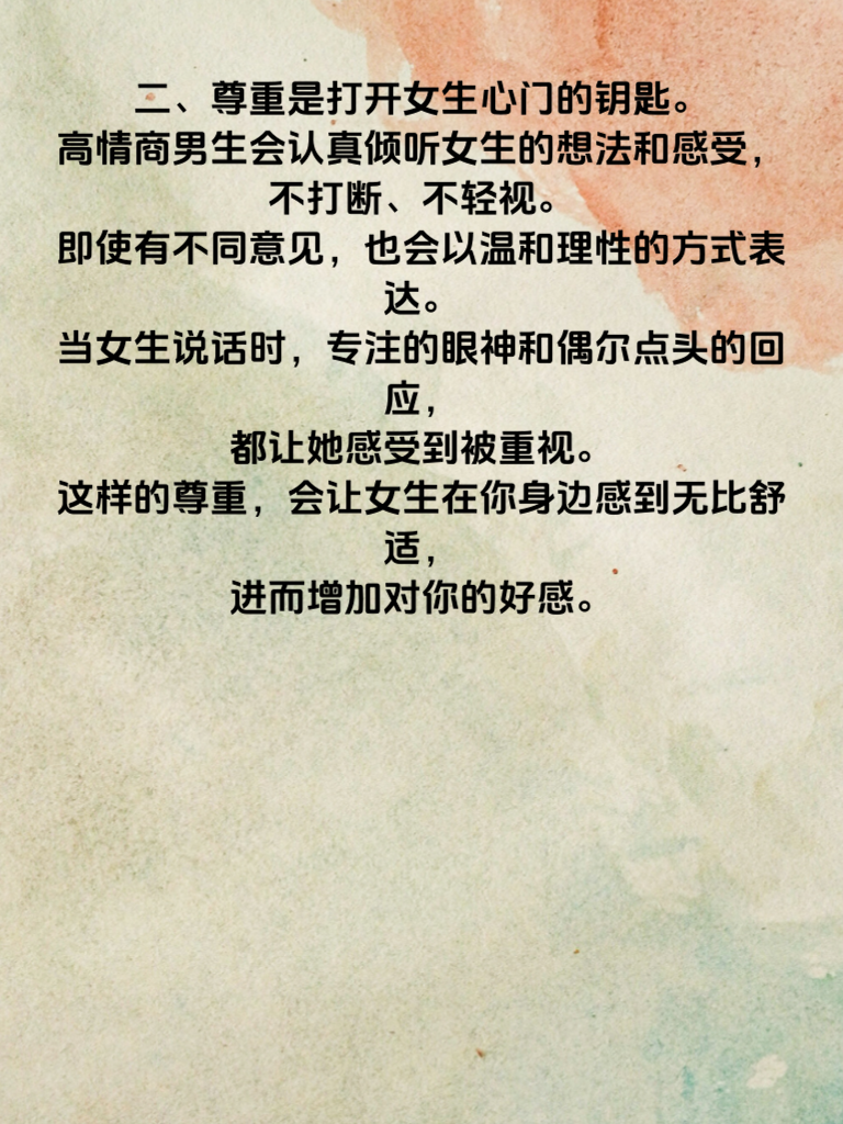 一、高情商的男生懂得营造独特的吸引力。他们不会刻意吹嘘自己,而是在日常交流中,不经意地展现自己的才华、兴趣和积极的生活态度。比如,分享自己最近读的一本有趣的书,或是讲述一次充满挑战又有收获的户外运动经历。这种自然流露的魅力,会像磁石一样吸引女生的目光。 二、尊重是打开女生心门的钥匙。高情商男生会认真倾听女生的想法和感受,不打断、不轻视。即使有不同意见,也会以温和理性的方式表达。当女生说话时,专注的眼神和偶尔点头的回应,都让她感受到被重视。这样的尊重,会让女生在你身边感到无比舒适,进而增加对你的好感。 三、适时制造一些小惊喜也很重要。不需要昂贵的礼物,一份亲手制作的小点心,或是一张写满贴心话语的卡片,都能让女生的心泛起涟漪。在特殊的日子,比如她的生日或纪念日,送上一份用心准备的惊喜,会让她觉得你把她放在心上,从而更主动地靠近你,想要追求这段美好的感情。