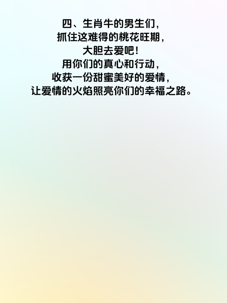 一、生肖牛的朋友们,你们知道吗?最近你们的桃花可是旺得不得了,爱情就像熊熊烈火般炽热燃烧!生肖牛的人通常踏实稳重,这种特质在感情中极具吸引力。 二、在追求爱情的道路上,生肖牛的男生有着独特的优势。你们真诚且执着,一旦认定了心仪的女生,就会全心全意去追求。比如,会用心记住她的喜好,在特殊的日子送上贴心的礼物。 三、要想让爱情之火越烧越旺,还得注意一些小技巧。聊天时多倾听她的想法,让她感受到被尊重。约会时精心安排,展现你的细心与体贴。 四、生肖牛的男生们,抓住这难得的桃花旺期,大胆去爱吧!用你们的真心和行动,收获一份甜蜜美好的爱情,让爱情的火焰照亮你们的幸福之路。