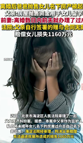 8月7日的北京,一男子婚后给女儿买了套房,9年后,他跟妻子离婚,离婚没几天,他就背着女儿,把女儿名下的房子赠予并过户给自己,然后悄悄给卖了,女儿愤怒的把男子告上法庭,要求男子赔偿自己1160万元损失,法院的判决让男子顿时傻了眼。