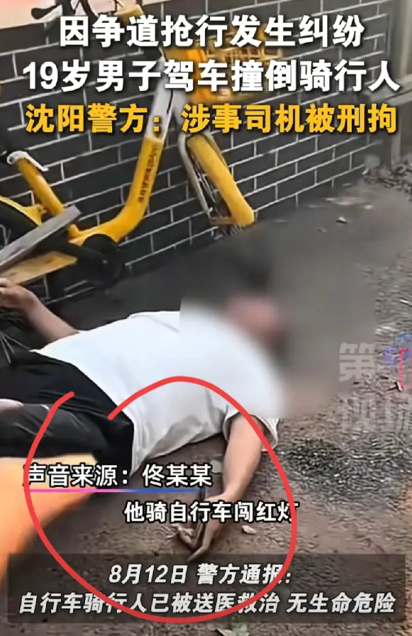 沈阳19岁小伙驾车撞人被刑拘!开车路怒,故意撞自行车男子!男子骑共享单车,抢绿灯快结尾,小伙开车要右转,很难绝对地说谁错,其实就是谁让10秒钟的事! 可是碰到00小伙暴脾气,才19岁,看男子头大腰粗的,也是社会人,二人你一句我一句,吵起来逞强,小伙自己开车往路边墙,挤撞男子!幸亏人没事!小伙已被刑拘,故意伤害罪了,一辈子案底,基本完了!00后小伙整顿,可是用错了地方!