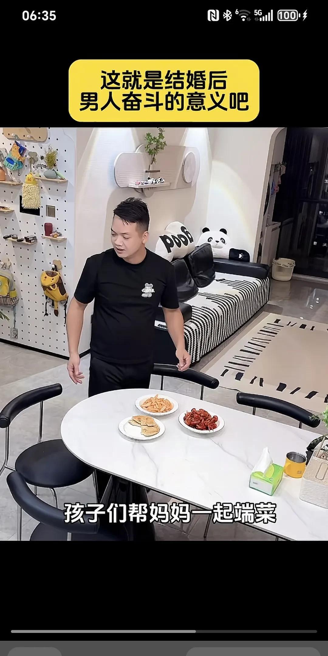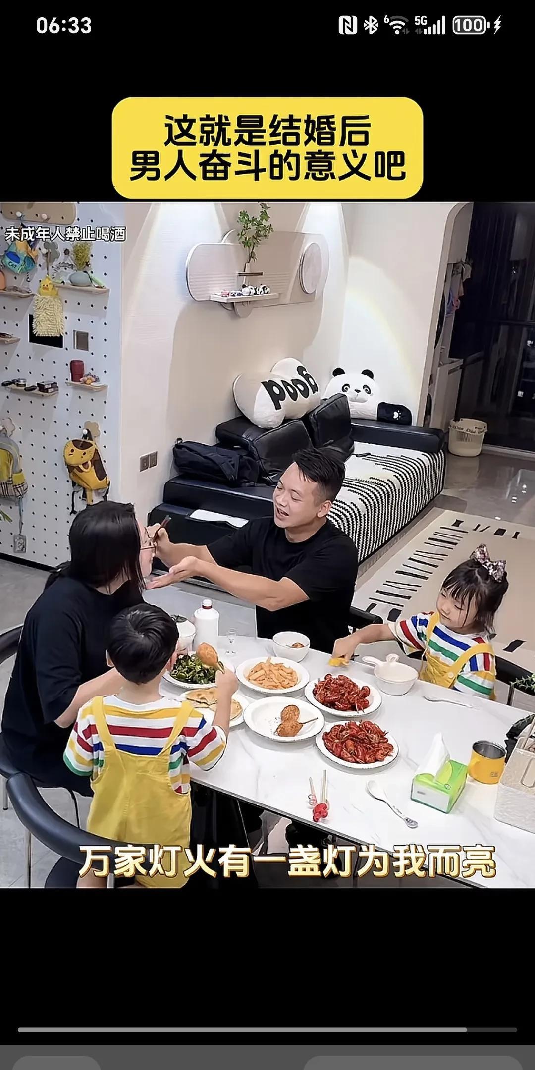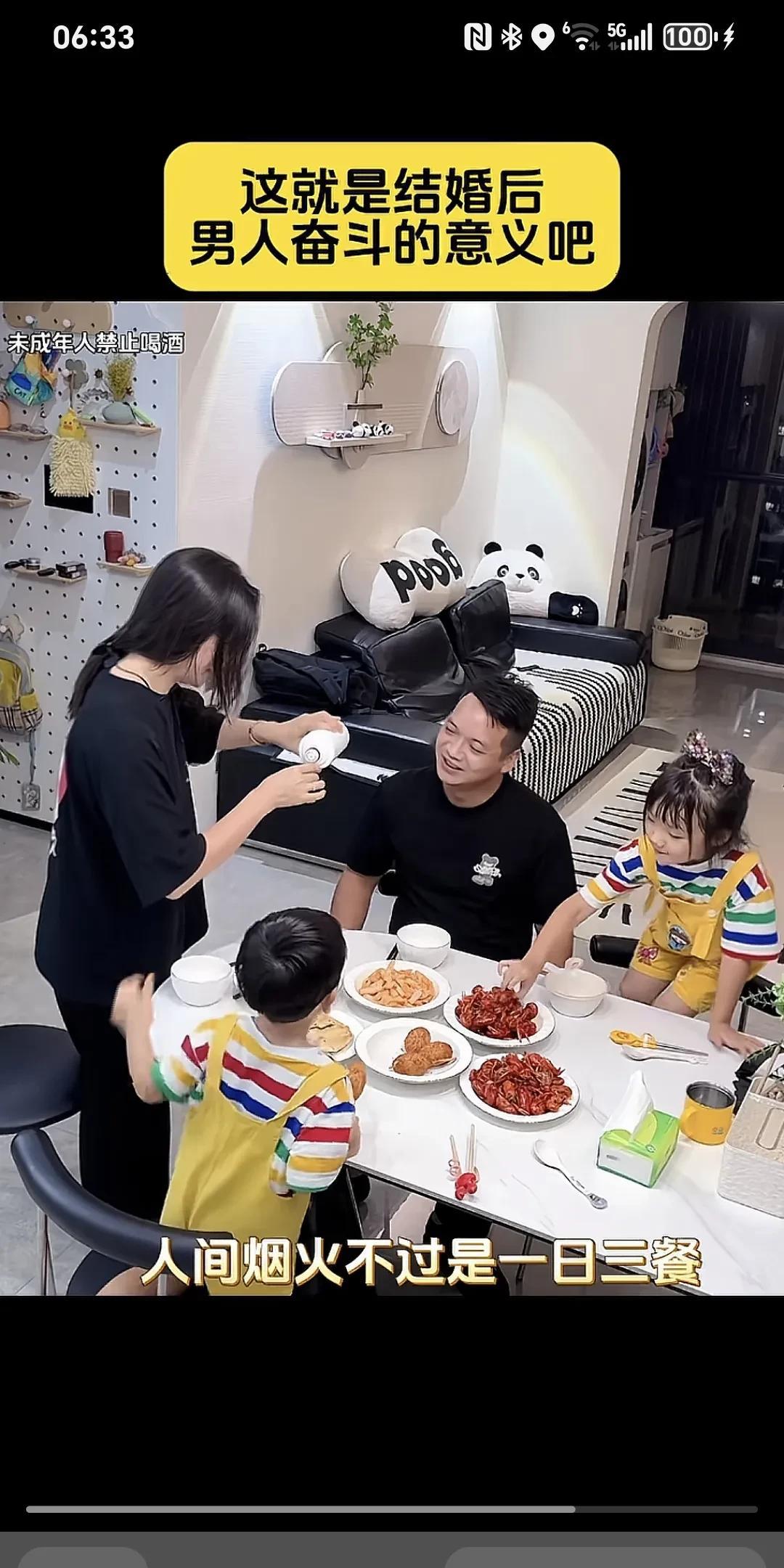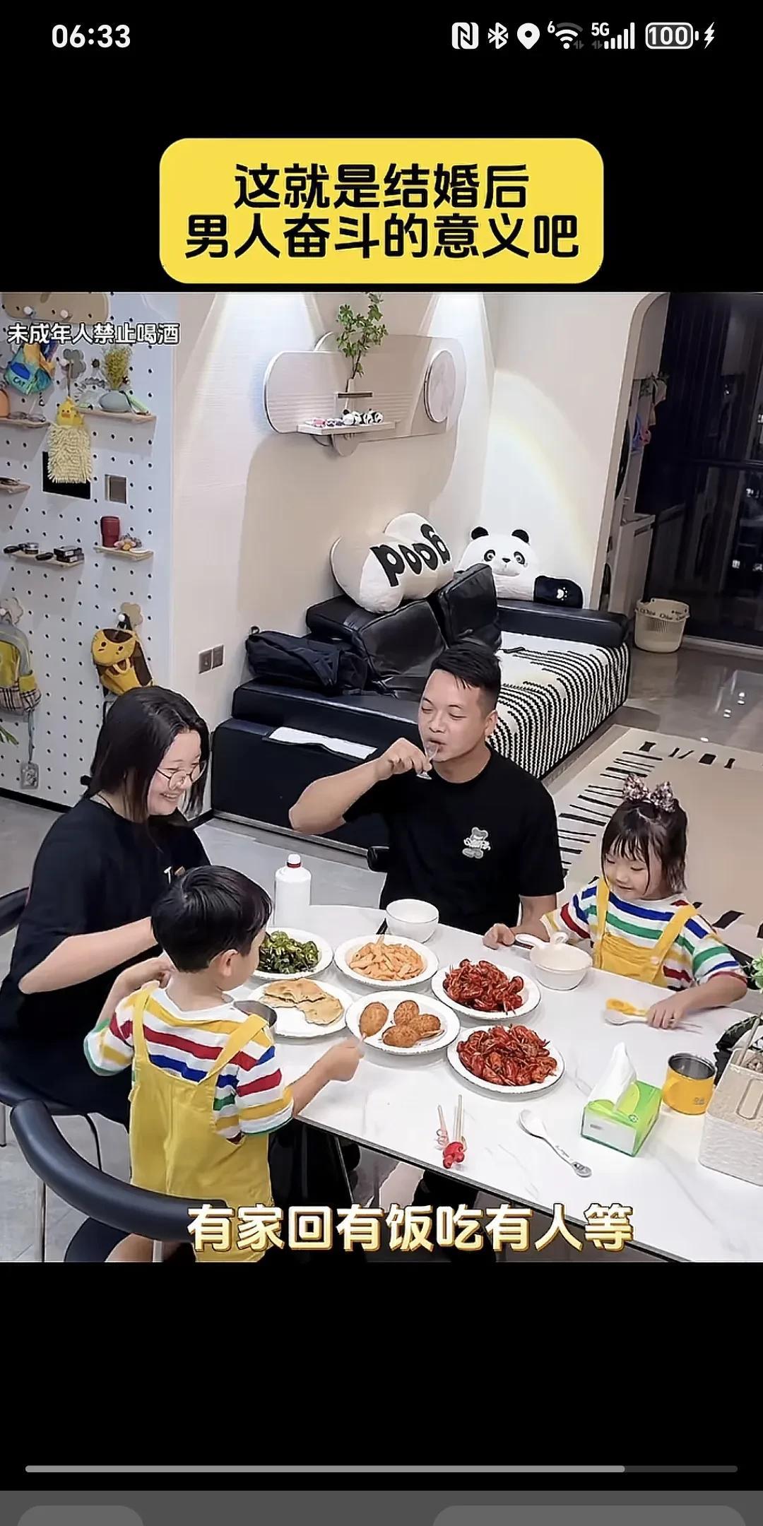 这或许就是男人婚后奋斗的意义了吧。 老公拖着疲惫的身躯回到家中,发现空无一人,原以为老婆会给他留好饭菜,结果却只是中午剩下的大饼,于是便大口吃了起来。闺女听到动静出来瞧了瞧,喊道:“妈妈,爸爸回来了。”孩子们欢快地跑到爸爸怀里,媳妇也走了出来,说道:“回来啦,饿了没?”说完便转身进厨房端出饭菜。女儿说:“爸爸,你坐这儿。”媳妇把饭菜端上桌后,老公问道:“你们怎么还没吃呀?”孩子们帮着妈妈一起端菜,媳妇回答:“这么多菜,必须给你整一杯酒。”人间烟火无非是一日三餐,幸福其实很简单,有家可回、有饭可吃、有人等候。万千灯火中有一盏为自己而亮,有温度的婚姻才称得上是家。 男人,拼了命也要护家人周全!所以自己舍不得给自己花钱。家人想要的一切都会尽力满足。这就是男人。 感动到了我 我眼泪都出来了 人间的爱 家庭的温暖 活在人间 就是需要这样的甜蜜幸福的港湾 。 这就是男人奋斗的的意义吧[祈祷][祈祷][祈祷]#婚后的真实感悟# #婚后真实心情#