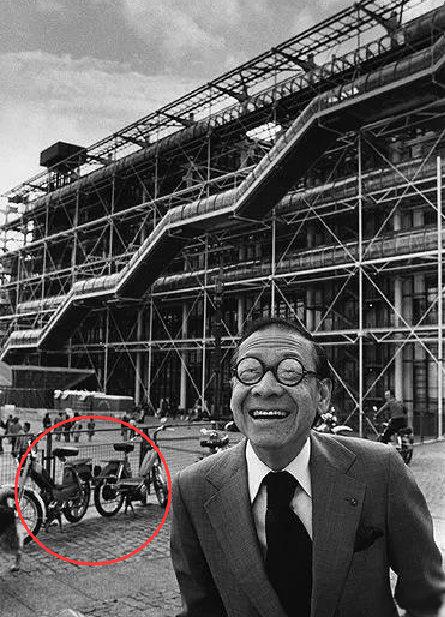 这张照片是1989年,贝聿铭在巴黎蓬皮杜博物馆外拍的。大师身后,竟然有两辆电动自行车?难道是我眼瘸了。