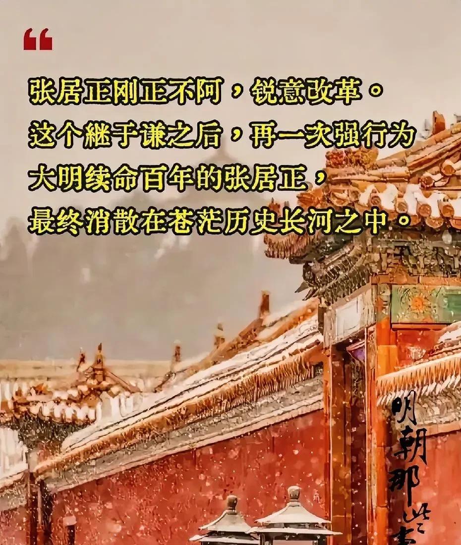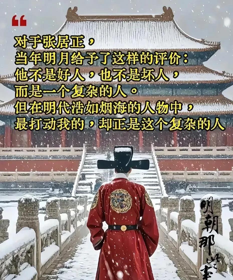 这幅图描绘的是张居正在大雪中独自上朝的情景。万历八年的隆冬,北京大雪纷飞,万历皇帝怜悯百官,准许休朝一日。但张居正刚从外地归来,没有接到诏令,于是顶着风雪独自上朝。这一举动令万历皇帝大为感动,便亲自出殿迎接。这一情节生动地体现出张居正在复杂政治局势里的孤独和执着。他推行改革之际,遭遇重重阻碍,却一直坚定不移,这种精神引起了人们的共鸣,特别是那些身处困境但依然为理想拼搏的中年人,他们从中获得了情感慰藉。《明朝那些事儿》的作者当年明月对张居正有这样的评价:他既不是纯粹的好人,也不是纯粹的坏人,而是一个复杂的人。不过,在明代众多人物当中,最让我为之感动的,恰恰就是这个复杂的人。