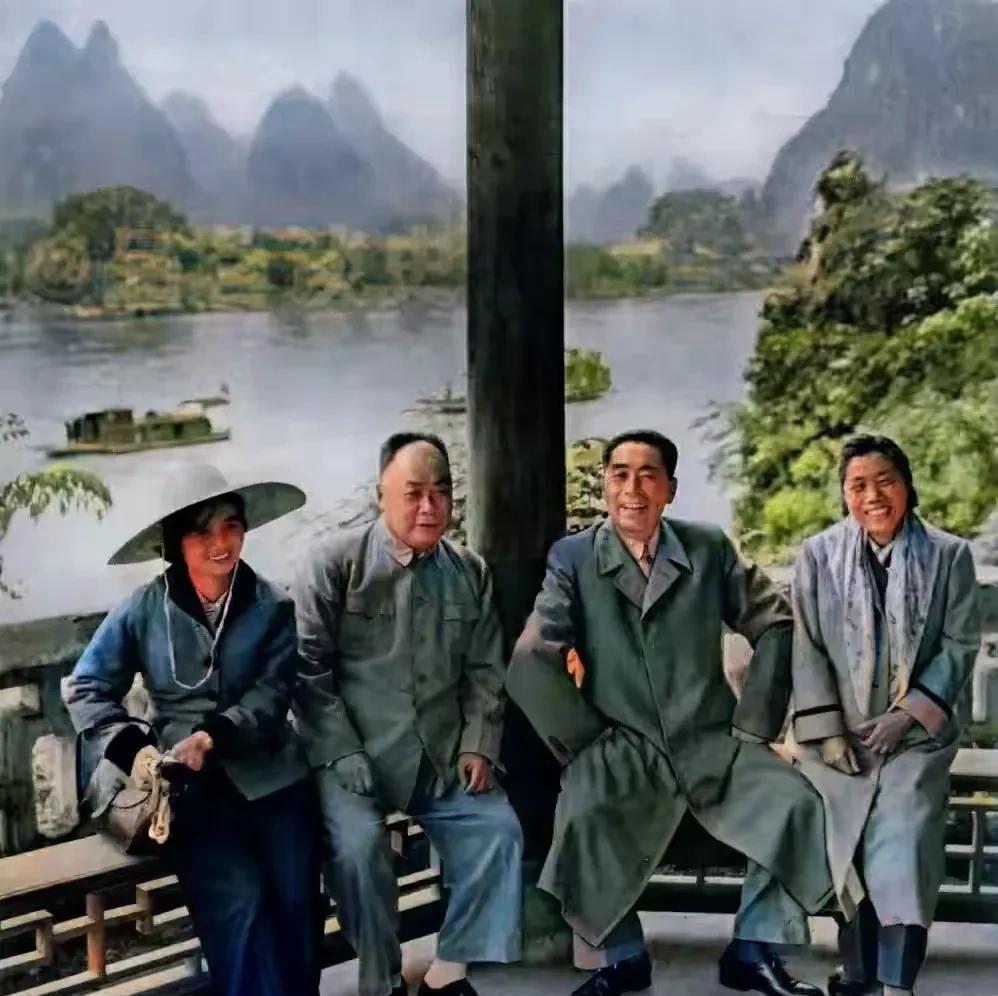 上世纪60年代,周恩来总理夫妇和陈毅元帅夫妇同游桂林山水,小憩期间,留下了这张珍贵的留影照片。 照片从左至右分别是:陈毅元帅夫人张茜、陈毅元帅、周恩来总理和邓颖超大姐。 面对镜头时,大家都露出了亲切的笑容,或许,优美绝伦的桂林山水令他们都暂时忘却了工作的疲劳,看得出来,沉浸在这样的山水间, 他们的心情都显得无比的舒畅!
