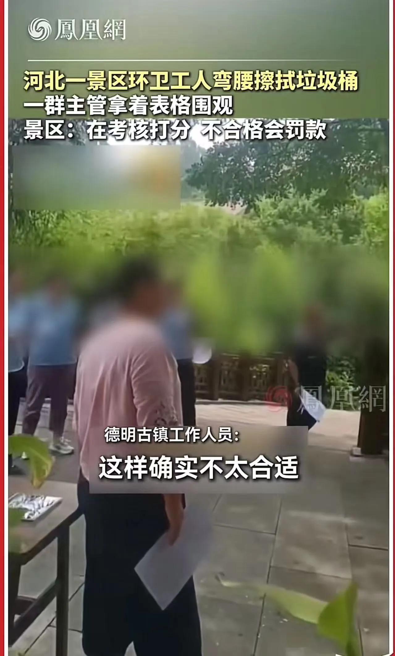 太讽刺了!河北一景区环卫工人弯腰擦拭垃圾桶,一群主管却站着围观!景区:在考核打分,不合格会罚款!网友:一个人干活,6个人监督,干活的工资一千多,监督的工资八千多!考核的退休后一万多,干活的退休后几百块,这就是现状! 网传视频显示,环卫工在烈日下拿着抹布擦拭垃圾桶,干得满头大汗,而旁边六个主管拿着表格在围观,时不时的还指手画脚。 有游客看不下去,一个人脏兮兮的干活,养活了六个干干净净的领导,不干活的指挥干活的,滑天下之大稽! 这不是妥妥地浪费人力资源吗?这么多主管要发多少工资?还不如多请几个环卫工人,每个人工作少一点,活干得更快,景区也可以更干净! 于是游客把这个视频发到了网上,景区对此解释:站在旁边的确实是主管们,当天再考核环卫工的工作情况,谁的工作做得更好,会得到相应的分数或者相应的工资奖励。考核如果不通过,就会有一定的罚款。主管们看起来有点散漫,这样确实不太合适! 此事引发了热议,有网友说,边上一圈人都寄生于他一个人身上,这叫什么我词穷了。这一幕多么的讽刺,现在刚刚下发关于治理形式主义的文件,请问这算不算形式? 也有网友说,现在普遍现象就是:一个人在干,一群人在管,出力的是挣的最少的!我就想问问,这些领导干过这些活吗?如果没干过,他考核的标准是啥? 还有网友说,你说这环卫工人和以前的奴隶有任何区别?之是把有形的脚镣变成无形的而已! 烈日下环卫工挥汗如雨擦垃圾桶,六个主管却手持表格"围观指导",这般荒诞场景堪称当代职场魔幻现实主义! 形式主义的官僚做派与基层劳动者的生存困境在此形成刺眼对比。景区所谓"考核评分"的解释,不过是给低效管理披上合理化外衣,当主管们连"监督"都要摆出散漫姿态,谁应该更优先被“考核”? 当考核标准脱离劳动实际,所谓的"现代管理"不过是将奴隶制的脚镣换成KPI的枷锁。形式主义从未远去,它只是换上了更体面的西装,继续吞噬着劳动者的尊严,我们一定要对着说不! (来源:凤凰网)