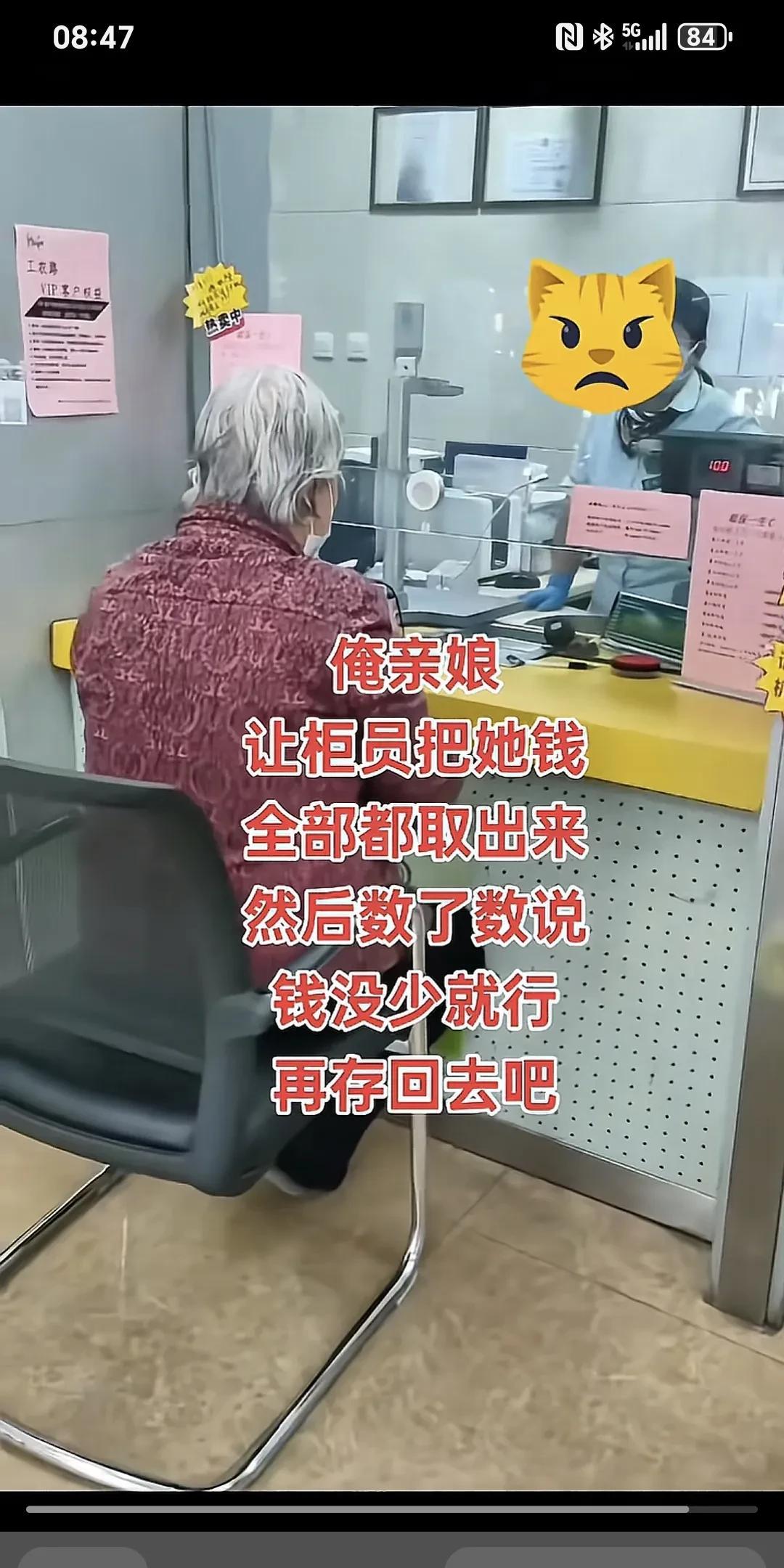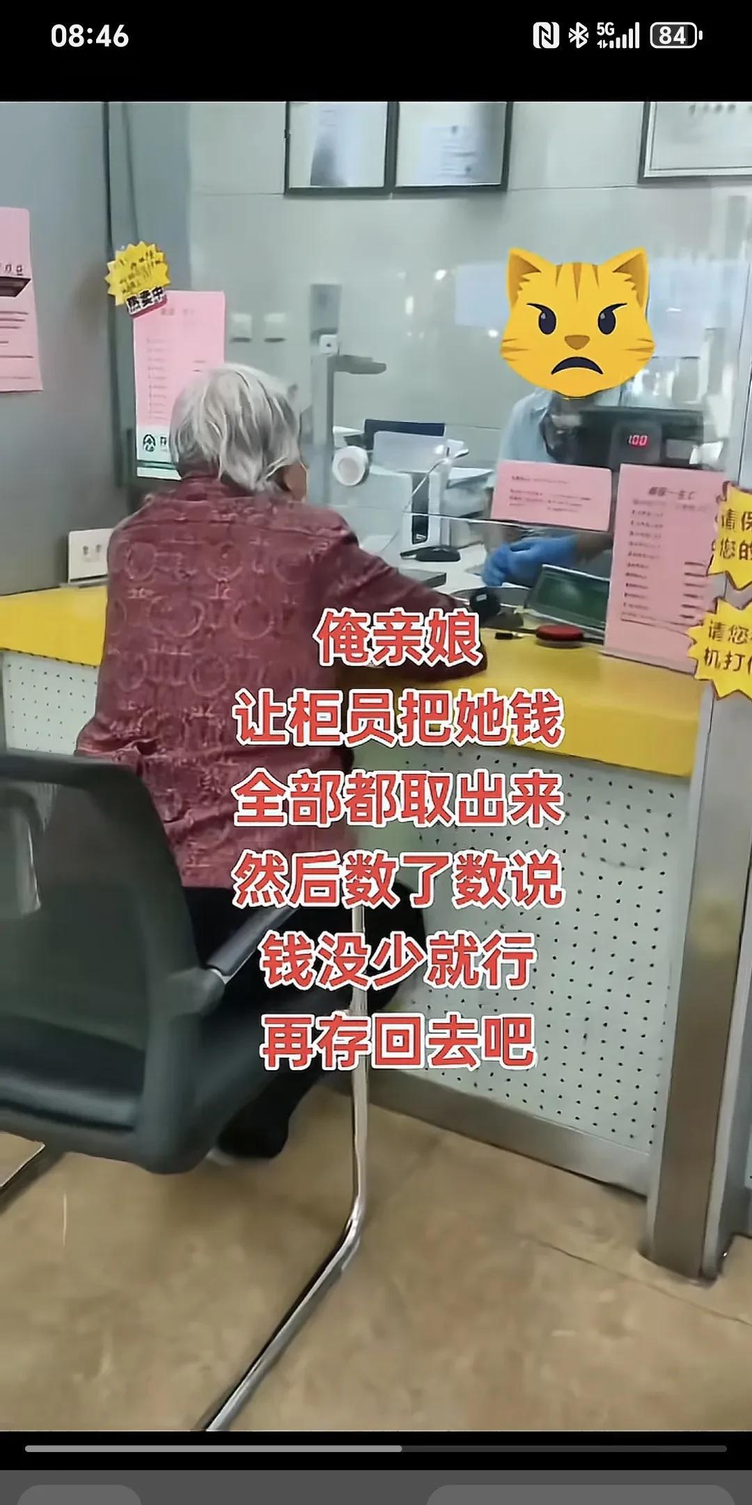 俺亲娘,让柜员把她的钱全部都取出来,然后数了数说钱没少就行,再存回去吧~ 我妈真是个人才,让我带她来银行,我还以为他取钱,想着要点钱花花,钱是取出来了数了数,说钱没少就好,这下我放心了,再存进去吧,柜员无语的眼神......真是服了。 对喽,我们今后要向奶奶学习、没事时到银行都取出数数在存里、这样银行员工也有存在感、我们也放心挺好的。 老太太是真正的明白人,她们年轻时穷怕了,老了攒了几个钱不容易呀,搁那里都不放心,可怜天下父母心[比心][比心][比心]#老人去银行取钱#