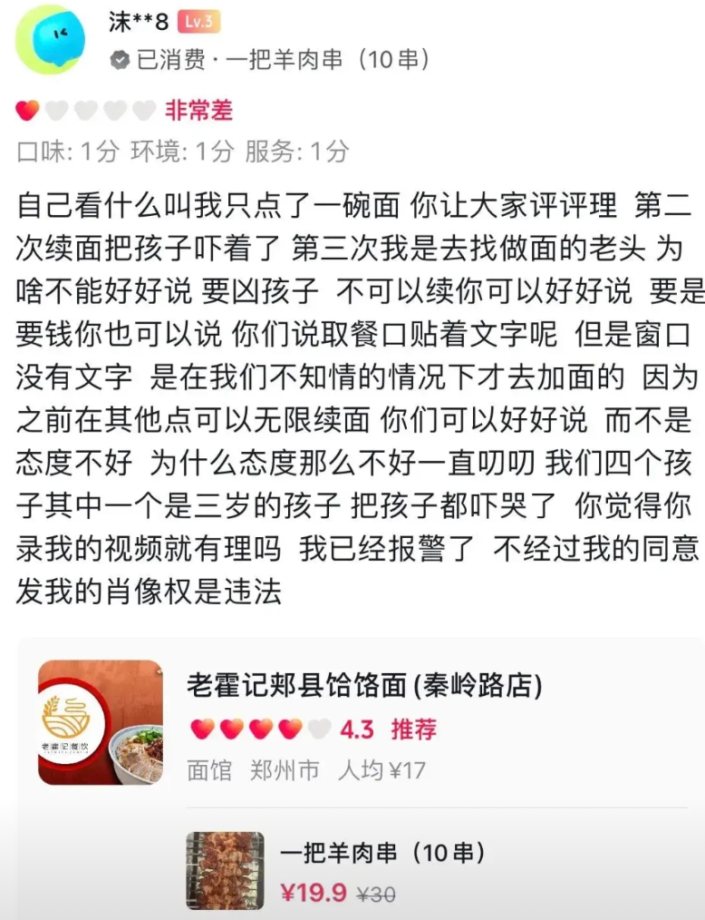 续面事件这次是真相大白了,不是谁拍视频谁就有理! 店老板太小气,人家明明花了140多,只说人家点了一碗面! 做生意和气生财,要讲究实事求是,店老板就是不想给她加面,也应该客客气气的说! 既然有无限加面,只加了第三次,如果加第四次,你可以就事论事!而且人家消费了100多,我觉得完全可以接受第三次续面! 而且这个老板名声不太好,这次追到别人店里拍这位女士的视频,本想网暴她人,没想到网友们会八他的老底,把自己给网暴了!