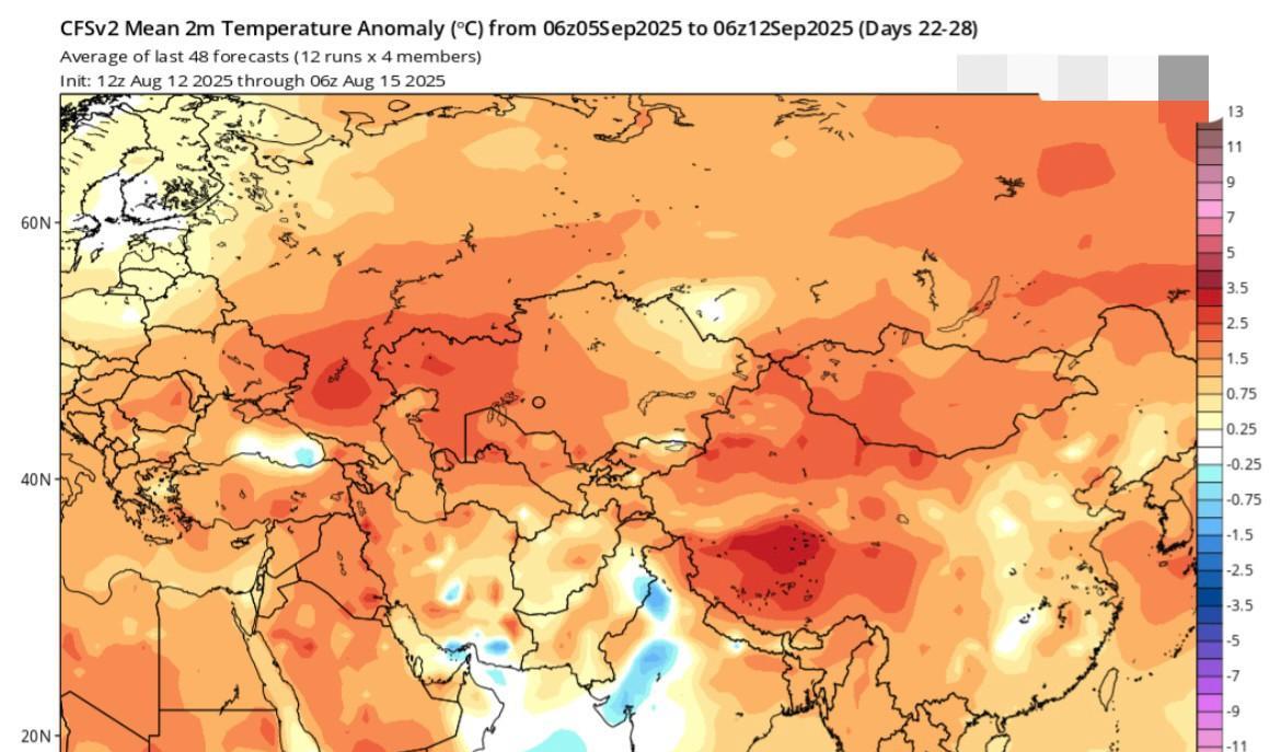 【远期天气观望】根据CFS环流预报 未来一个月当中 冷色调从深到浅不断缩减。暖色调不断向中亚西亚东亚扩张蔓延趋势。包括西伯利亚地区大面积暖化现象。上述地区暖出新高。在这种气候复杂背景下,需要警惕长时间出现高闷热天气,防暑降温措施不容松懈。