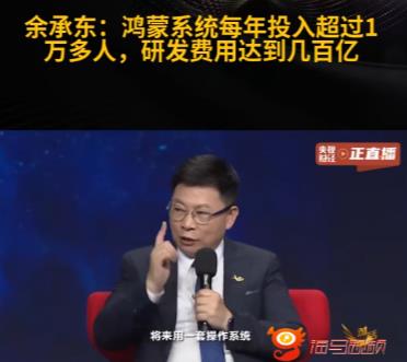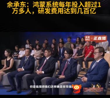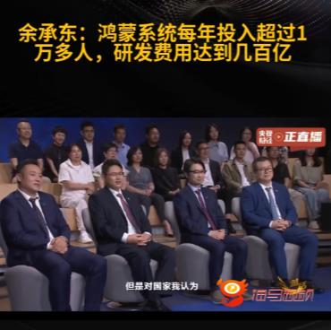 余承东在节目中讲述了鸿蒙系统的研发费用非常高,每年投入超过1万多人,持续6年多了,研发费用已经花了几百亿,代码1.3亿行。这些代码大部分是华为开发的,还有一部分是开源之后生态合作伙伴做的。