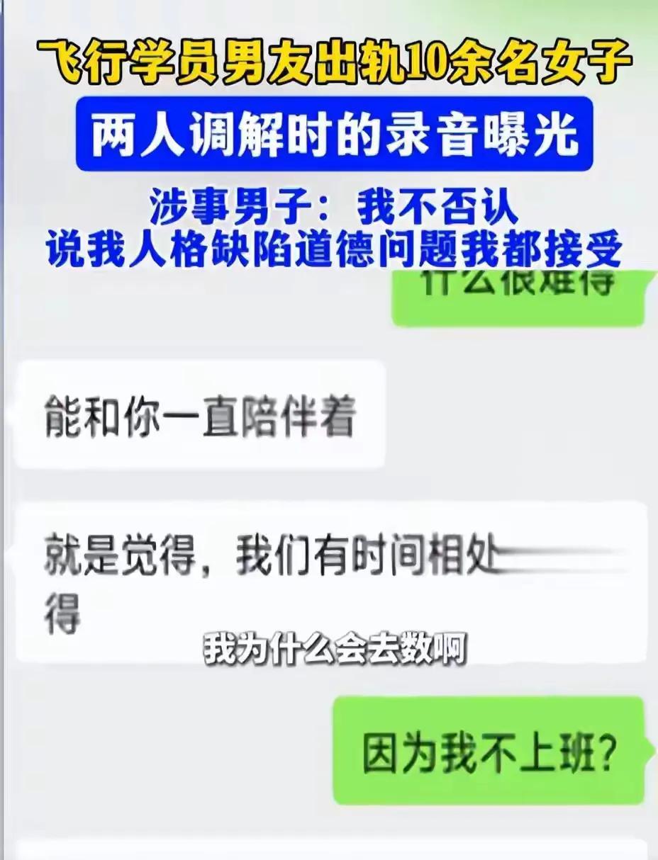 上海飞行员出轨10余女性 暧昧画面太露骨,还有录音证据 前女友悬赏50000取证,真相令人寒心 说真的,我最近刷到个事儿,看完直想拍桌子——你有没有遇过那种,一开始把你捧上天,甜言蜜语不要钱似的砸过来,结果转头发现,自己不过是他鱼塘里的一条鱼?上海那个邬女士,就撞上了这么个“人才”。 俩人是在社交软件上认识的,男方叫孟某,据说是个飞行员学员。你想想啊,穿制服的帅哥,一口一个“单身”,天天跟你说“宝贝你最特别”,换谁不迷糊?邬女士本来也觉得,这是天上掉下来的缘分,今年六月刚确定关系,就把人领回家了,食宿全包,简直是掏心掏肺。哎,现在想想,这哪是缘分,分明是坑啊! 本来以为能好好走下去,结果七月初,邬女士偶然拿了下孟某的手机,当场就懵了——你猜怎么着?这哥们儿老家不仅有个处了5年的女友,手机里还跟十好几个女的不清不楚!更崩溃的是,这时候邬女士发现,自己怀孕了。 我晕,这换谁受得了?一边是突如其来的新生命,一边是劈腿劈到外太空的“男友”,换我估计得原地爆炸。邬女士当时估计也是手脚冰凉,本来想找他好好谈谈,把事儿说开,结果呢?孟某嘴上说“见面聊”,身子却跟钉在地上似的,死活不露面。 后来邬女土士,忍无可忍,做了47页的ppt,发到网上和他公司,他在网上联想5万提供证据的网友,这事还没完,现在还在发酵中 总之,小编认为感情这方面一个巴掌打不响,但是这位女士说得非常厉害,佩服#约会出轨#