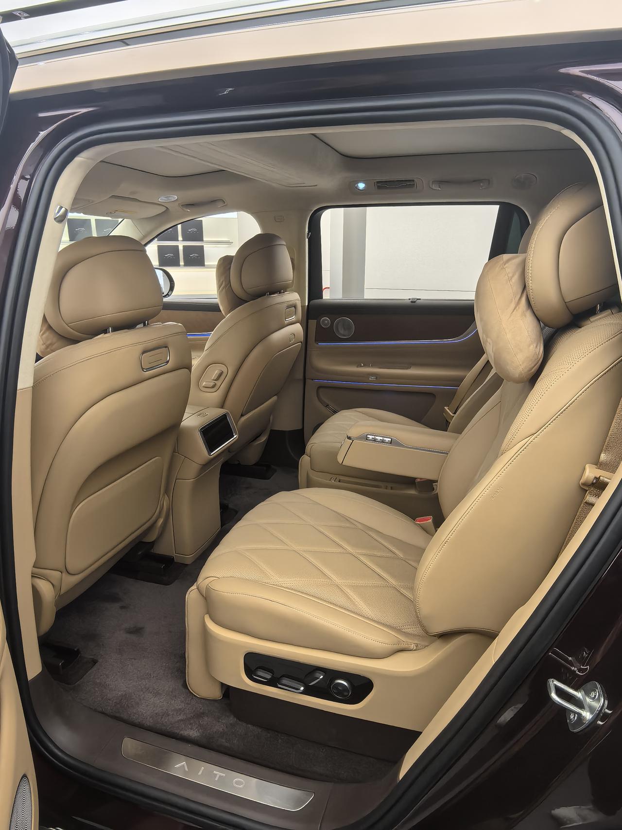 最近深度体验了华为问界M9,今天就来给大家唠唠它的储物空间,准备入手的朋友可以参考下~ 优点: 1. 后备箱容积大:五座版取消第三排后,后备箱常规状态下容积就有638L,纵深近1.2米,宽度超1.2米,放几个大行李箱完全没问题。像日常采购、自驾游装行李,空间都很充裕。把二排座椅放倒后,直接能拓展到1105L ,纵深达2.1米,能当小型货车用,拉个大件家具、露营装备都不在话下。六座版车型,第三排正常使用时,后备箱也能放些随身小行李;要是把第三排座椅放倒,容积同样可观,也有716L左右,能一次性容纳6个20英寸行李箱。 2. 车内储物格丰富:全车大大小小有38处储物空间,日常零碎物品都有地方放。比如主驾左侧有个隐私储物箱,不仅私密,还能放行车记录仪的卡槽,NAPPA真皮包裹,质感拉满;副驾的储物箱容量大,分层设计,放纸巾、零食、小物件很合适;中央扶手箱前面有个带盖板的储物格,里面还能给手机无线充电;杯架一大一小设计很贴心,放不同粗细的饮料都稳当,中间还有个不小的储物空间能放零碎东西,而且杯架有硅胶垫,清理碎屑很方便;门板下方空间也很大,能放好几瓶矿泉水 。 3. 独特设计实用:五座版后备箱配备“山海坐席”,有两个皮质座椅和小桌板,不用时能收纳到椅背后方,不占后备箱空间;需要时电动开启,能坐在上面休息、看风景。另外,后排还有个8L的双温控冷暖箱,冬暖夏凉,夏天冰饮料,冬天热咖啡,锁车后还能远程开启,很方便。 缺点: 1. 部分储物空间使用受限:中央通道两侧的储物格,因为位置原因,有时候座椅调节后会挡住,不方便打开拿取东西。扶手箱虽然有设计,但因为下方是后排冰箱,所以深度一般,放不了大尺寸物品。而且副驾因为设计了电动脚踏,没有扶手箱,相比主驾这边,储物空间少了些。 2. 第三排满载时后备箱局促:六座版车型在满载六人情况下,后备箱容积仅161L ,这个空间就比较小了,放不下太多行李,要是一家人长途旅行带的东西多,就有点不够用,得把第三排座椅放倒来拓展空间。 3. 细节设计有小瑕疵:座椅侧面设计了放手机的地方,但是行驶过程中容易产生异响;后排座椅的储物兜比较深,手很难摸到最底部,要是有灰尘、杂物掉进去,清理起来特别麻烦 。 总的来说,华为问界M9的储物空间在很多方面表现不错,大空间和丰富的储物格满足了大多数场景需求。但也存在一些小问题,希望后续能进一步优化改进。大家要是对M9感兴趣,建议去4S店实际体验下它的储物空间~