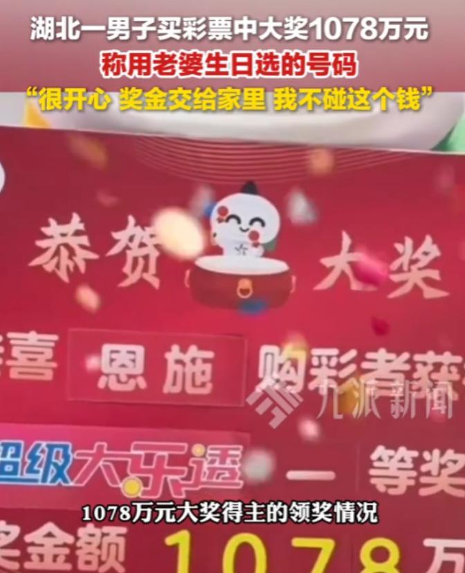 “这就是命啊!”8月13日,湖北恩施,一男子买彩票中了1078万元的巨额大奖,扣完税,到手862.4万元。而这中奖号码,竟然是他老婆的生日,中奖后,男子非常开心,还表示奖金要全部交给家里,自己不碰这个钱!网友:爱妻者风生水起![微风] 这位大哥买彩票的年头可不短了,比很多年轻人的年龄都大,坚持买了20多年,他买彩票也不盲目跟风,每期就按自己的心意选几个号。 他常说:“不买肯定中不了,买了心里总有个盼头”,这么多年下来,偶尔也能中个几十几百的,虽说不是大奖,但也能给家里添点零花钱。 8月初的一天,大哥像往常一样来到彩票站,他盯着走势图琢磨了半天,想着要不换组号码试试,正想着,突然脑海中闪过老婆的生日,心里一动,“就用这个号!” 他当时或许只是抱着试试看的心态,可谁能想到,开奖那天,他核对号码时,手都开始颤抖了,每个数字都精准对上,竟然中了个头奖! 去兑奖的时候,大哥特意带着老婆一起,工作人员询问他当时的心情,他笑得嘴都合不拢,反复说着太开心了,还坚定地表示钱要交给家里。 周围的人听了,都对他竖起大拇指,夸他实在,据邻居们说,这大哥平时就特别疼老婆,家里不管大事小事,都会跟老婆商量着办,工资卡也一直是老婆在管。 这次中了大奖,大家原本猜测他会不会先买辆豪车,或者换套大房子,可没想到,他第一时间想到的就是把钱交给老婆,让家庭来支配这笔财富。 消息传到网上,有网友感慨:“爱妻者风生水起,这话一点不假,大哥平时就对老婆好,心里装着家庭,这次中奖也是他应得的福气。” 还有人调侃:“看来以后买彩票,都得用家里人的生日试试,说不定也能沾沾喜气。” 也有网友表示,大哥能坚守20多年买彩票,这份坚持本身就很难得,中奖也是对他这份坚持的一种回报。 在我看来,这位大哥中大奖固然有运气成分,但他对家庭的用心和责任感才是最值得称赞的,彩票中奖是偶然事件,可平日里对家人的关爱和付出才是生活幸福的基石。 他把奖金交给家里,是对妻子多年来为家庭默默付出的认可,也是他作为家庭顶梁柱的担当。 当然,对于普通人来说,买彩票还是要理性,不能过度投入,毕竟生活还得靠脚踏实地的努力。 正如网友所说:“真正的财富,不是中了多少奖,而是拥有一个幸福美满的家庭”,希望大家在生活中,都能像这位大哥一样,用心经营家庭,说不定哪天,幸运也会悄然降临。 对此大家有什么看法?