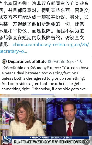 美国驻华使领馆今晚(8月19日晚)写道:“卢比奥国务卿:除非双方都同意放弃某些东西,并且都同意对方得到某些东西,否则交战双方不可能达成一项和平协议。另外,如果某一方得到了他们所想要的一切,那就不是和平协议,而是投降。而我不认为这场战争会在短期内以投降告终。”