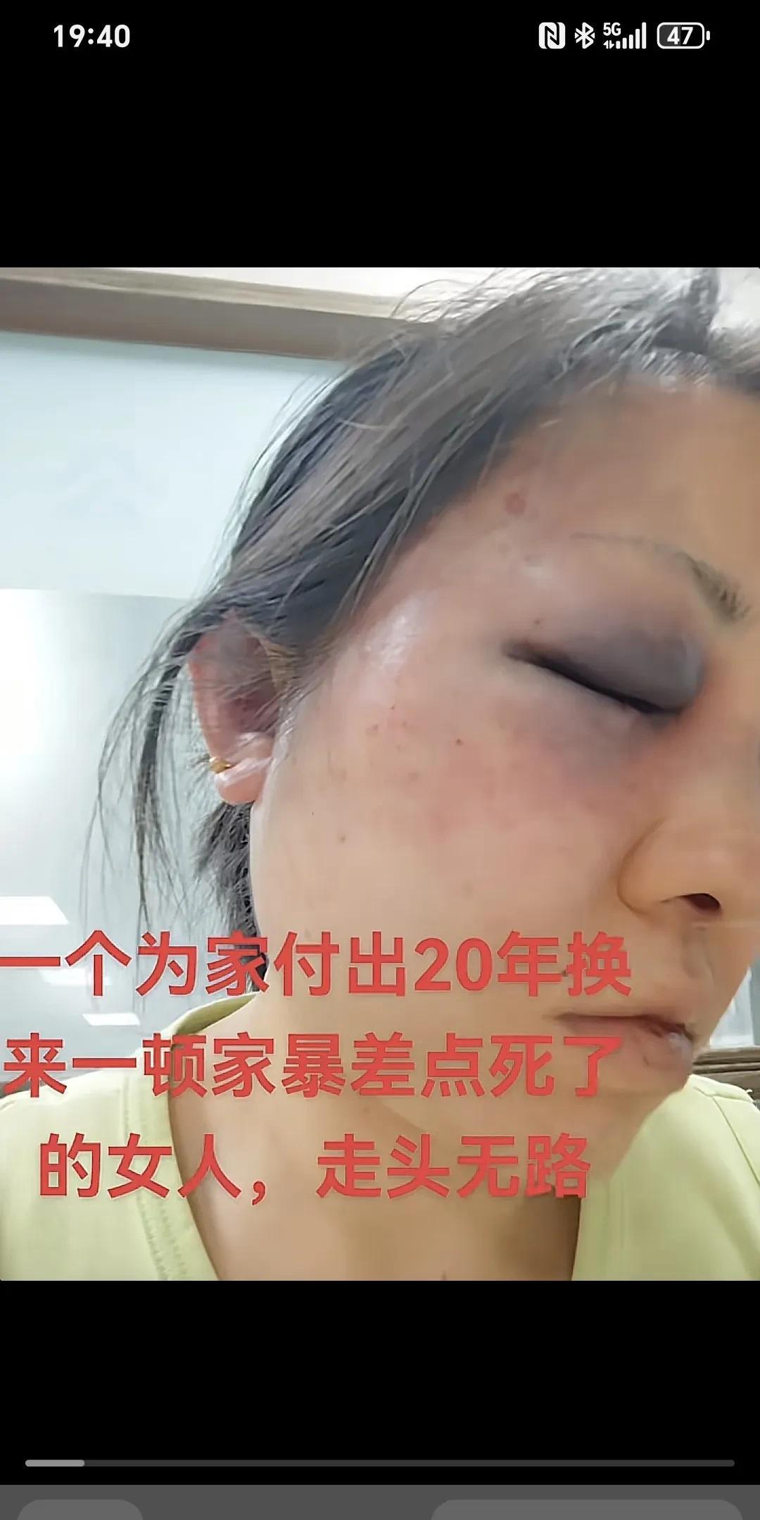 一个为家付出20年换来一顿家暴差点死了的女人,走投无路~ 一个为家付出20年换来一个愚孝恋母男的家暴,要不是邻居救下我,可能已命丧黄泉已,那种恐惧现在还心有余悸,我知道江湖不相信眼泪,社会不同情弱者,实属无奈,走投无路,想活下去而已。 你让着他,他就欺负你。这个年头有手有脚,谁离开谁都能过日子。干嘛要忍辱负重?
