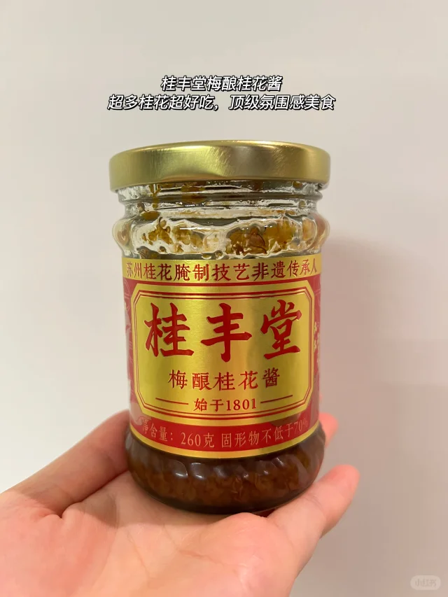 5️⃣桂丰堂梅酿桂花酱 跟其他桂花蜜不一样,这款有淡淡梅子清香,味道酸甜,桂花含量超高,可以搭藕粉,蘸年糕或者做桂花鸡头米都好吃!和各种糖水都超适配!