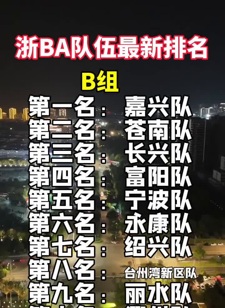 浙BA队伍最新排名(截至8.20)。 A组 →第一名:温州队。 →第二名:杭州队。 →第三名:嘉兴经开区队。 →第四名:湖州队。 →第五名:金华队。 →第六名:余姚队。 →第七名:台州队。 →第八名:柯城队。 →第九名:诸暨队。 →第十名:庆元队。 ·B组: →第一名:嘉兴队。 →第二名:苍南队。 →第三名:长兴队。 →第四名:富阳队。 →第五名:宁波队。 →第六名:永康队。 →第七名:绍兴队。 →第八名:台州湾新区队。 →第九名:丽水队。 →第十名:衢州队。