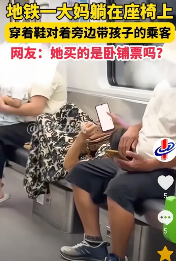 “地铁卧铺”!福建,一位穿着一身干净的长裙子,挎着一个包的大妈,在地铁上购买了一张“卧铺票”,她躺在座位上刷着手机,脚穿着鞋对着一个带小孩的乘客,毫不顾忌他人感受。