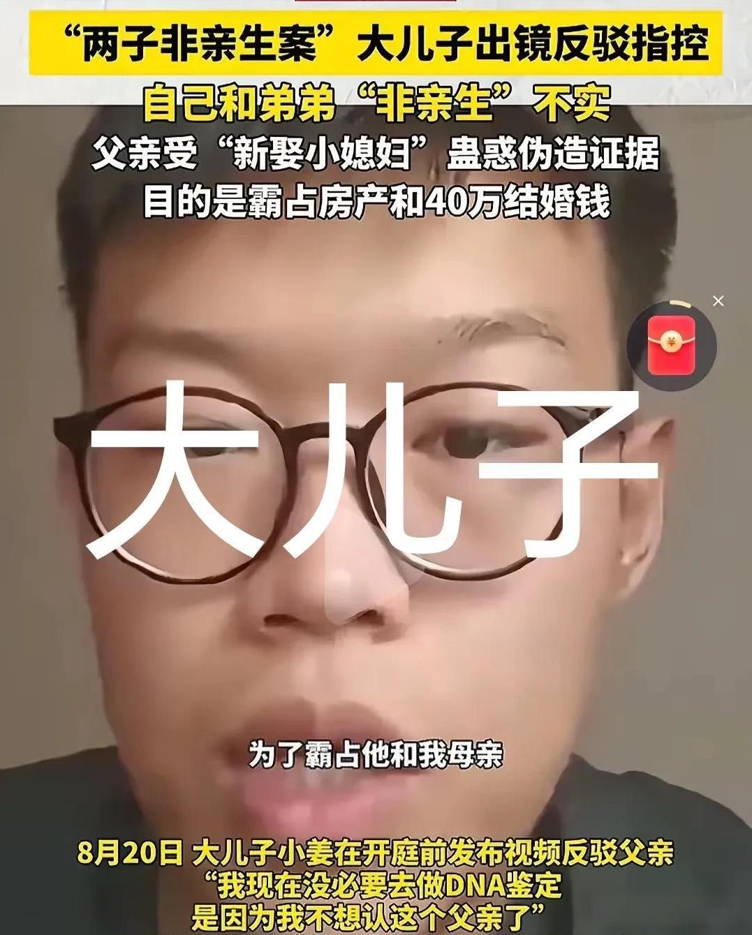 二审已经认可鉴定结果,两孩都不是他的,但大儿子却不认,一直闹腾,目的很明确,爹可以不认,但财产得要! 小儿子有姜洪涛堂哥兜底(已经给了一套价值300万的房子,200平米),说明早就认亲了,而大儿子呢?村支书这边不认,就算母亲去闹,村支书也不承认,因此大儿子现在两边都靠不上了,就选择继续欺负老实的养父! 面对镜头,他竟然笑得出来,还不承认打过养父,结果监控视频都出来了,按道理他可以闭嘴了,但还是嘴硬,辩解自己抱摔养父的原因…但他就是说出花来,也是打了养父,如果是亲生父亲,他下得去手吗?所以,说白了就是没感情,就是把养父当成了钱罐子。 还有,如果承认鉴定结果,那养父赠送的房子,钱,他都得退还,所以,这也是他一直不去法庭,一直不承认非亲生的原因,主要就是想保钱财! 而姜洪涛知道两个孩子非亲生的原因令人唏嘘,原来是大儿子回来要钱时,发生了矛盾,骂了他一句“窝囊F”,然后还说“你不是我爸…” 他这才感觉不对劲,才拿他(大儿子)的牙刷去做DNA鉴定! 所以说,这个大儿子,现在这样闹腾,心里根本就对养父没一点感情,没有养育之恩,有的只是榨取他财富的心思! 因此支持老姜利用法律维权,追回自己的财产,然后追究前妻法律责任!