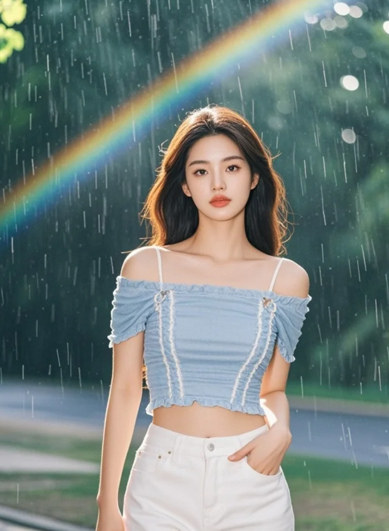 雨水洗净铅华,彩虹为幕,她便是天地间最纯粹的色彩。