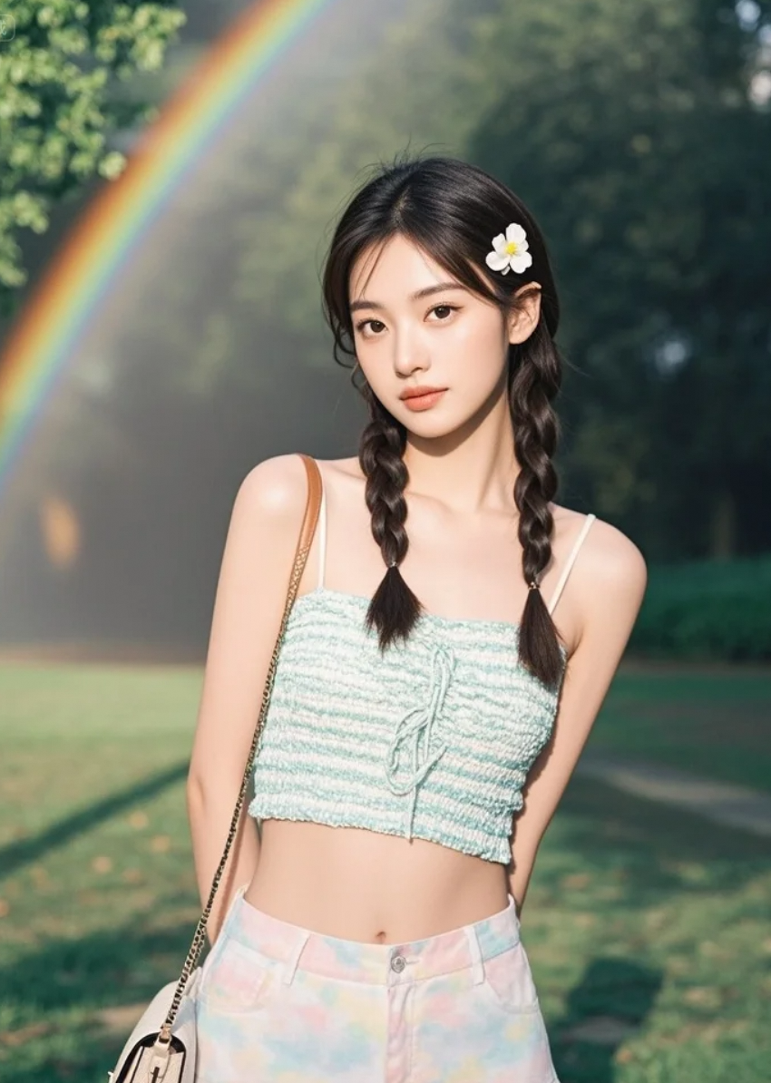 雨滴吻过花瓣,她站在虹桥尽头,笑靥比彩虹更摄人心魄。