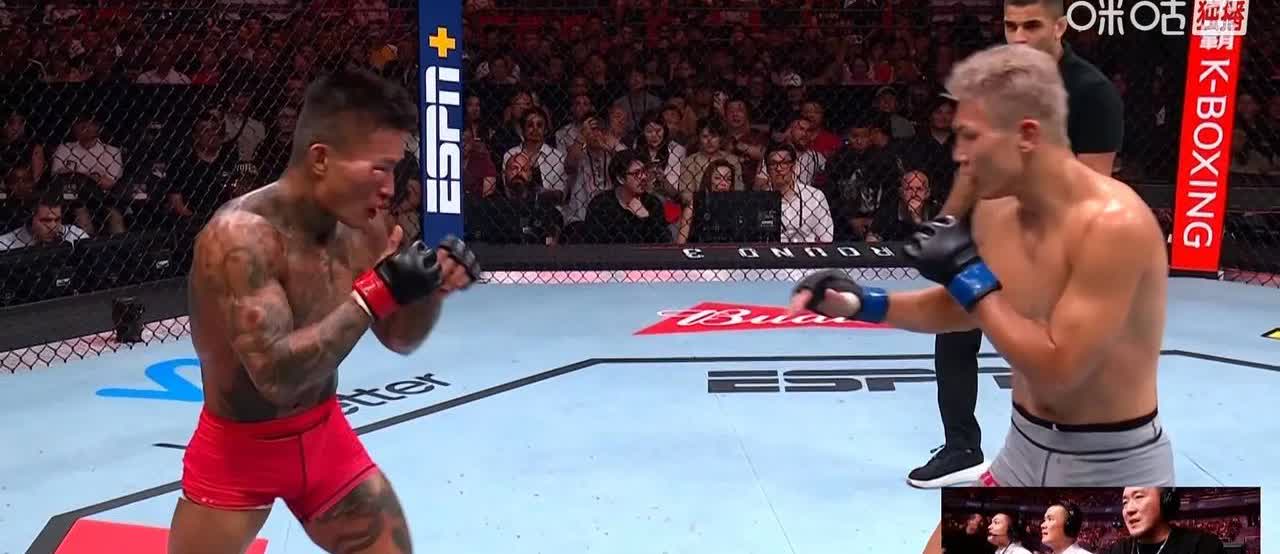 UFC第四季精英之路上海站,羽量级半决赛,黑马李凯文不敌小日本中村京一郎,李凯文赛前状态拉满,民族情绪完爆,八角笼里瞬息万变。 第一回合李凯文全程不给中村机会,大比分占优,第二回合右眼肿起来,影响视线,明显右边来的拳看不到,比赛受影响,第三回合完全靠意志力打满比赛。 中村京一郎打法飘逸,对于比赛的阅读能力极强。第二回合对凯文的右眼重点进攻,小日本就是这么坏,李凯文的比赛就是千万别给我机会,让我抓到机会比赛就结束了。 今后的路该怎么走?加油凯文!