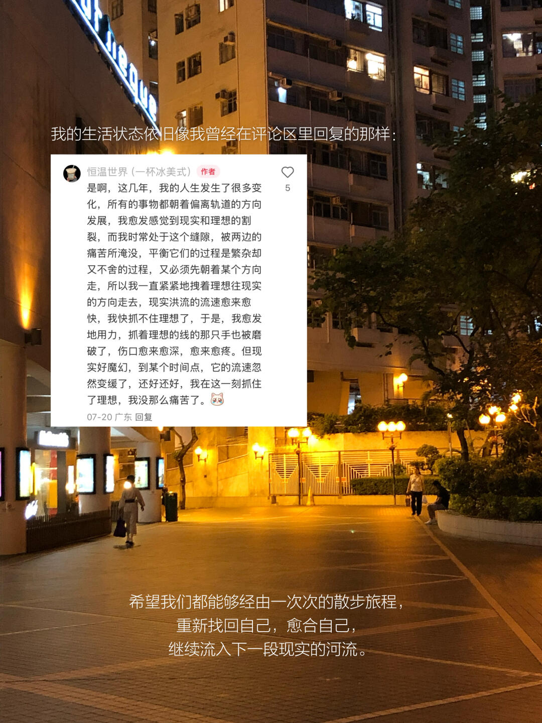 我在香港漫步,让自己的情绪流淌在这座城市,好的、坏的事物都流出身体,那时的感受是一条缓缓流动的河流,不断地填充我现实与理想之间的缝隙,弥合它们的裂痕,经由看见的事物和新生的感受去塑造出新的我。