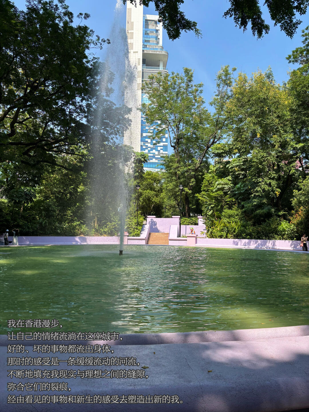 我喜欢在九龙公园主喷泉旁的绿荫大道,走在那条路上,阳光透过缝隙洒落在我身上,忽明忽暗地闪烁着,仿佛是内心正在重新孕育的期许,我感觉内心深处的裂缝正在温热中愈合。