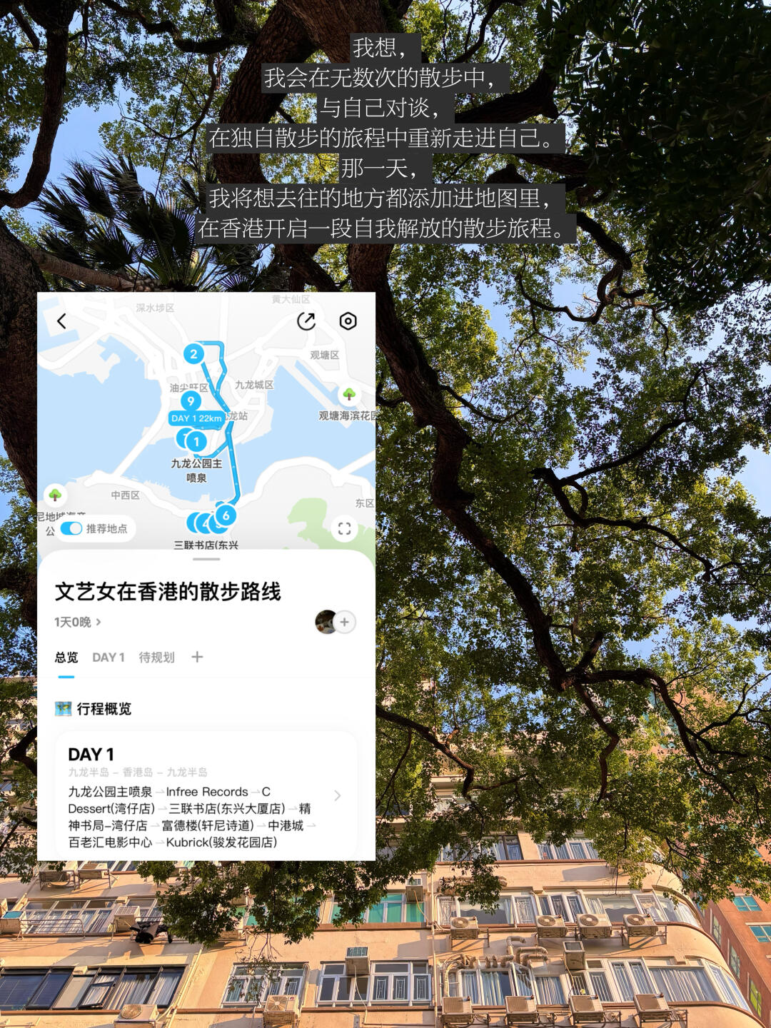我想,我会在无数次的散步中,与自己对谈,在独自散步的旅程中重新走进自己。那一天,我将想去往的地方都添加进地图里,在香港开启一段自我解放的散步旅程。