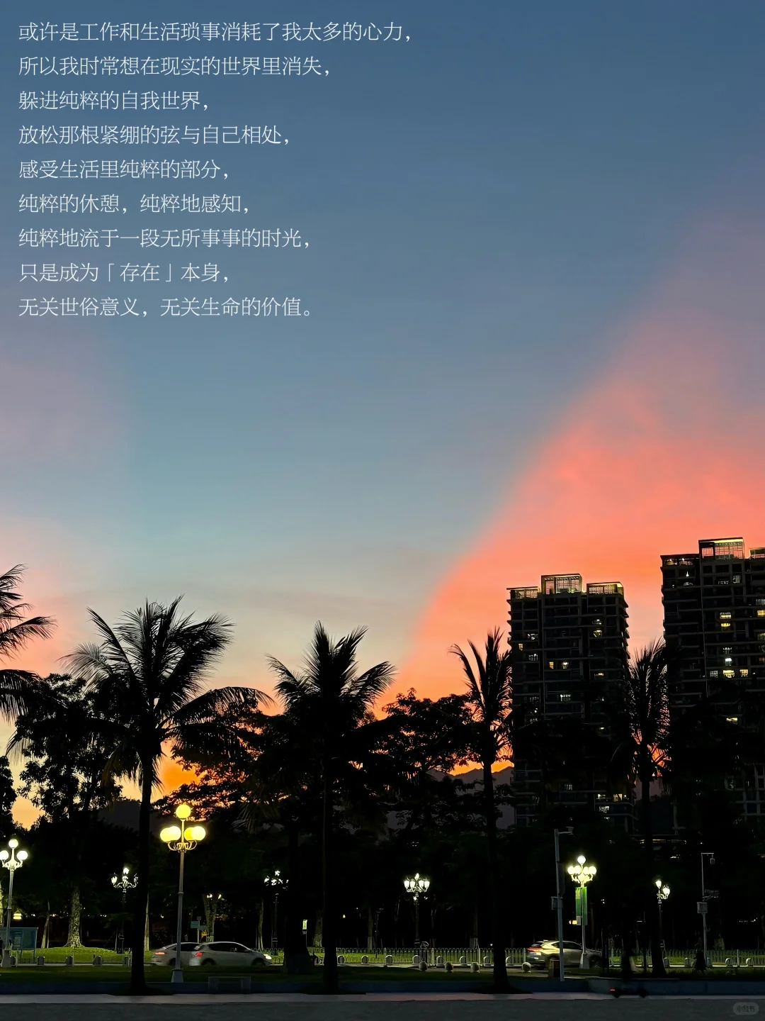 我时常希望自己能活在简单的世界里,只是安静地存活。或许是工作和生活琐事消耗了我太多的心力,所以我时常想在现实的世界里消失,躲进纯粹的自我世界,里面有我熟悉的味道,放松那根紧绷的弦,感受生活里纯粹的部分,纯粹的休憩,纯粹地感知,纯粹地流于一段无所事事的时光,只是成为「存在」本身,无关世俗意义,无关生命的价值。