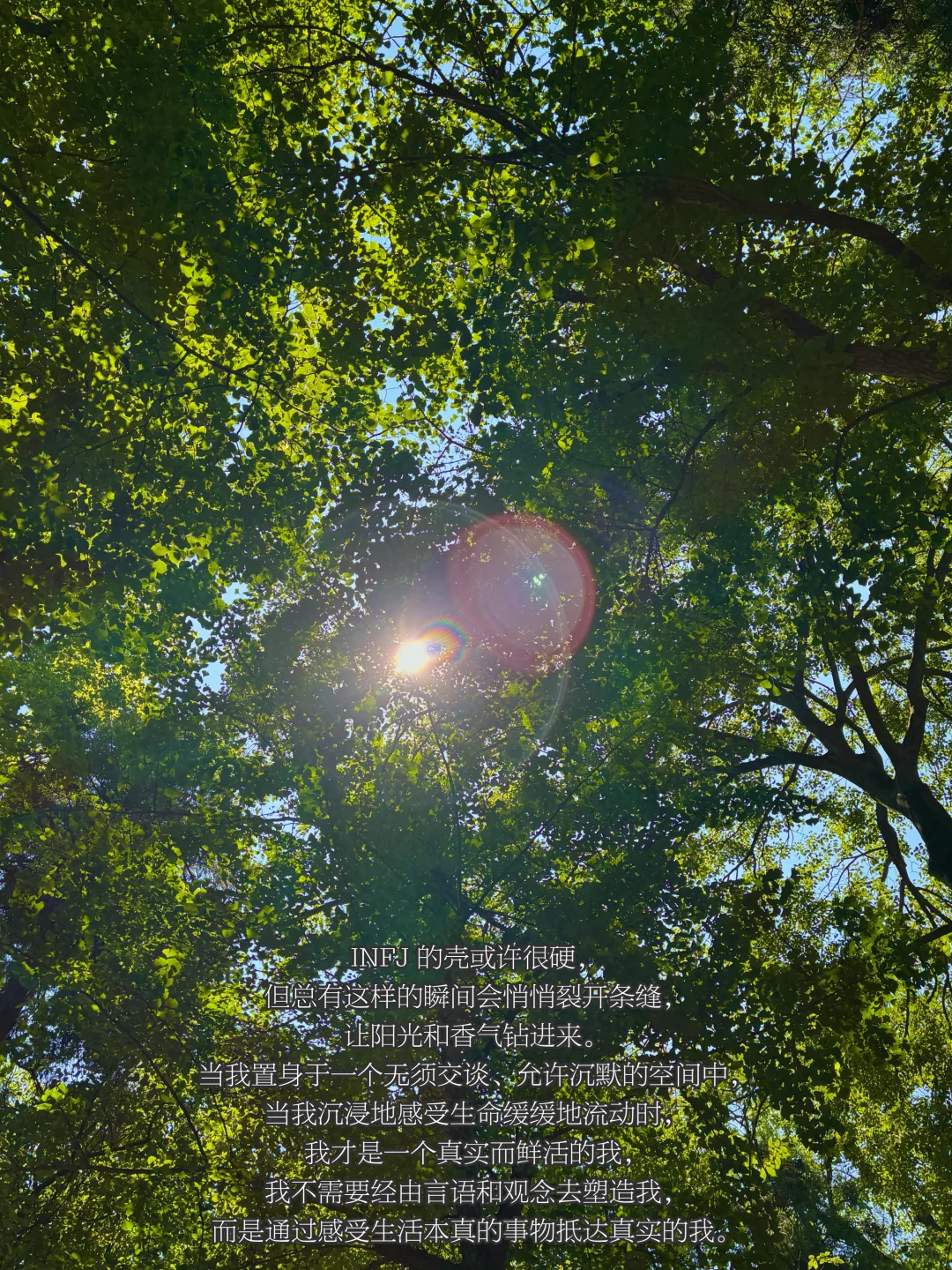 INFJ的壳或许很硬,但总有这样的瞬间会悄悄裂开条缝,让阳光和香气钻进来。当我置身于一个无须交谈、允许沉默的空间中,当我沉浸感受生命缓缓地流动时,我才是一个真实而鲜活的我,我不需要经由言语和观念去塑造我,而是通过感受生活本真的事物抵达真实的我。