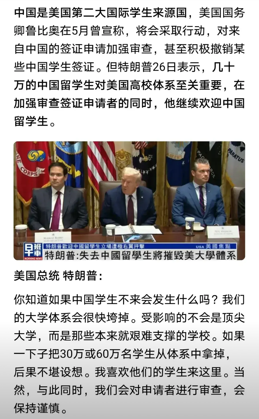 特朗普指出,如果中国学生不来,美国大学体系会垮掉,那些本身就难以支撑的学校会更难,后果不堪设想。