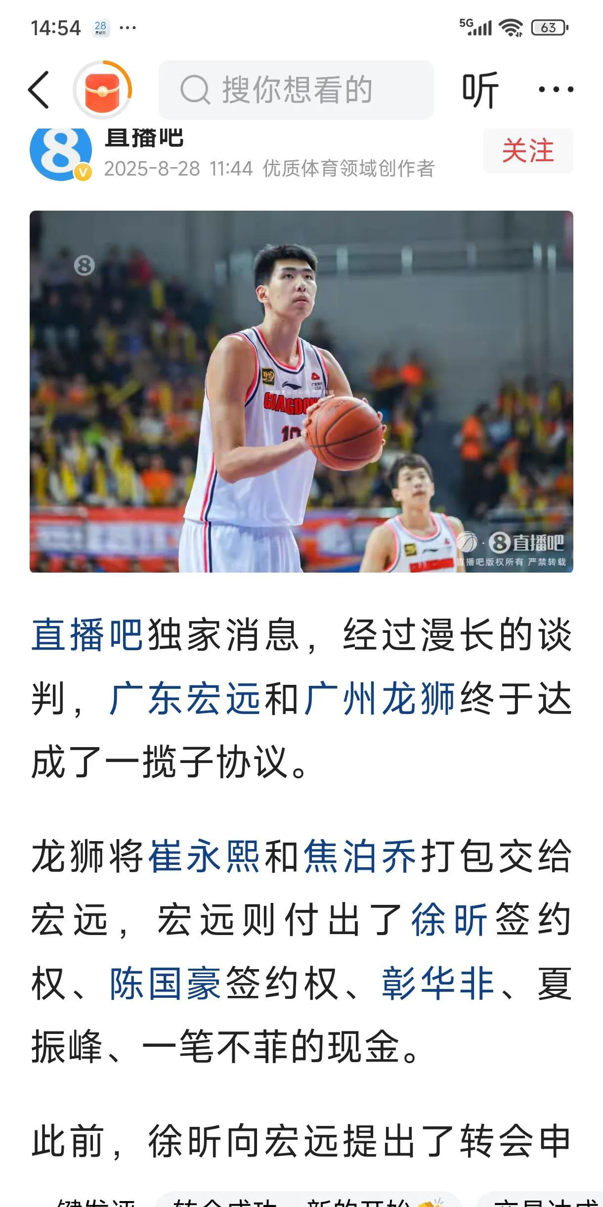 据网上多家消息,徐昕被打包送到广州龙狮俱乐部,一起送走的还有刚从北控交易来还没来得及进宏远男篮大门的陈国豪,以及彰华非、夏振峰和一大笔现金,换来的则是焦泊乔和崔永熙,如果这个消息属实,我只能说这是广东宏远队最糊涂的交易,真的值吗,焦泊乔和崔永熙都是大伤归来,即战力能恢复到什么程度,这都不好说,就算没有伤病影响,这两人的能力也只能说一般而已,如果把焦泊乔是郇斯楠、崔永熙是王俊杰,这还差不多,徐昕还有很大的培养价值,上赛季已经有了进步,而陈国豪也不输崔永熙,身体素质更好,广东宏远这样的操作真的是瞎折腾。 如果真的是这样,我觉得球队最该 交易的朱芳雨和杜峰,同意的举手。