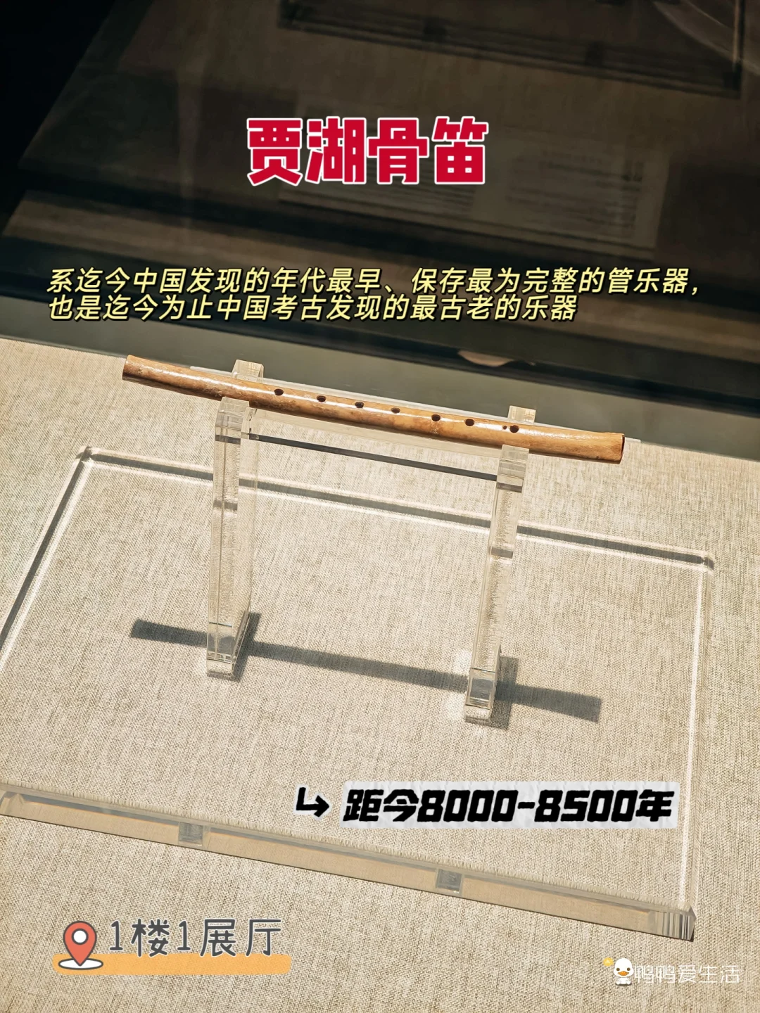 1️⃣贾湖骨笛:📍1楼1展厅,系迄今中国发现的年代最早、保存最为完整的管乐器,也是迄今为止中国考古发现的最古老的乐器