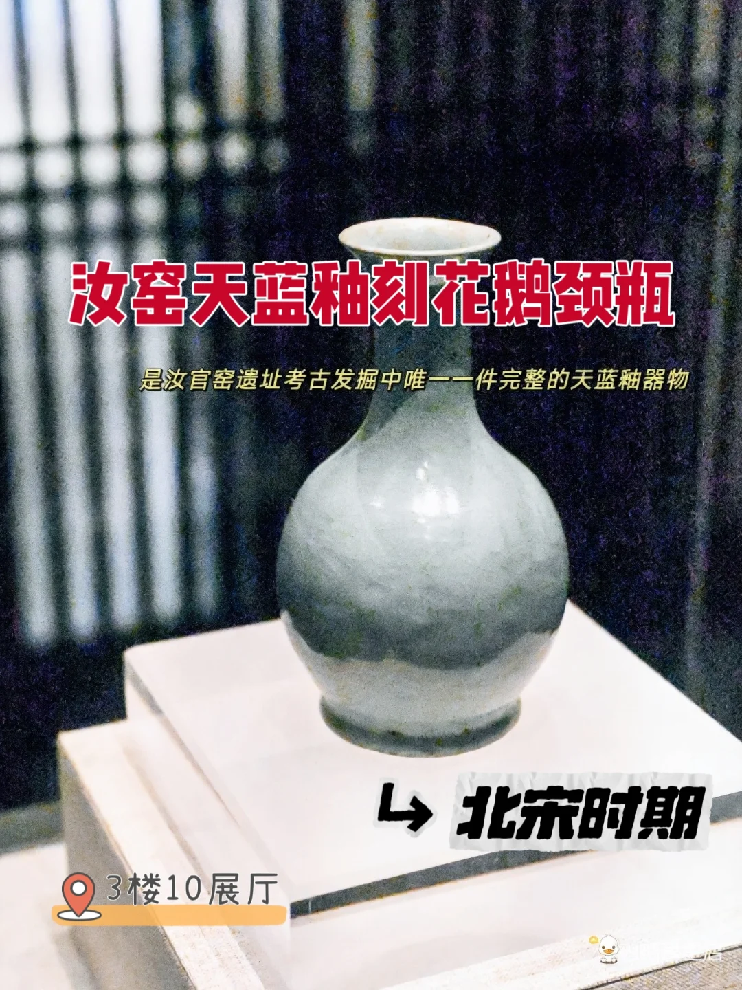 8️⃣汝窑天蓝釉刻花鹅颈瓶:📍3楼10展厅,是汝官窑遗址考古发掘中唯一一件完整的天蓝釉器物