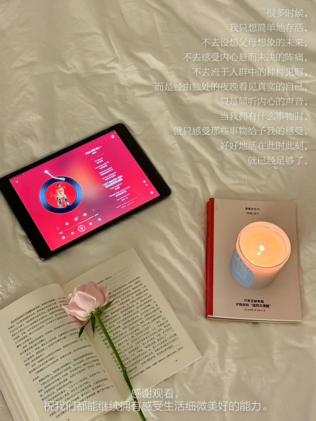 很多时候,我只想简单地存活,不去设想父母想象的未来,不去感受内心悬而未决的阵痛,而是经由独处的夜晚看见真实的自己,只是倾听内心的声音,当我拥有什么事物时,就只感受那些事物给予我的感受,好好地活在此时此刻就已经足够了。