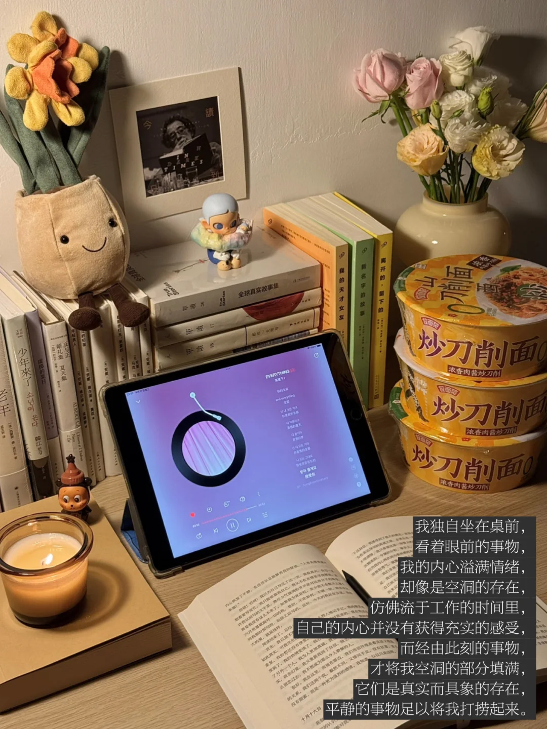 我独自坐在桌前,看着眼前的事物,内心溢满情绪,却像是空洞的存在,仿佛流于工作的时间里,自己的内心并没有获得充实的感受,而经由此刻的事物,才将我空洞的部分填满。