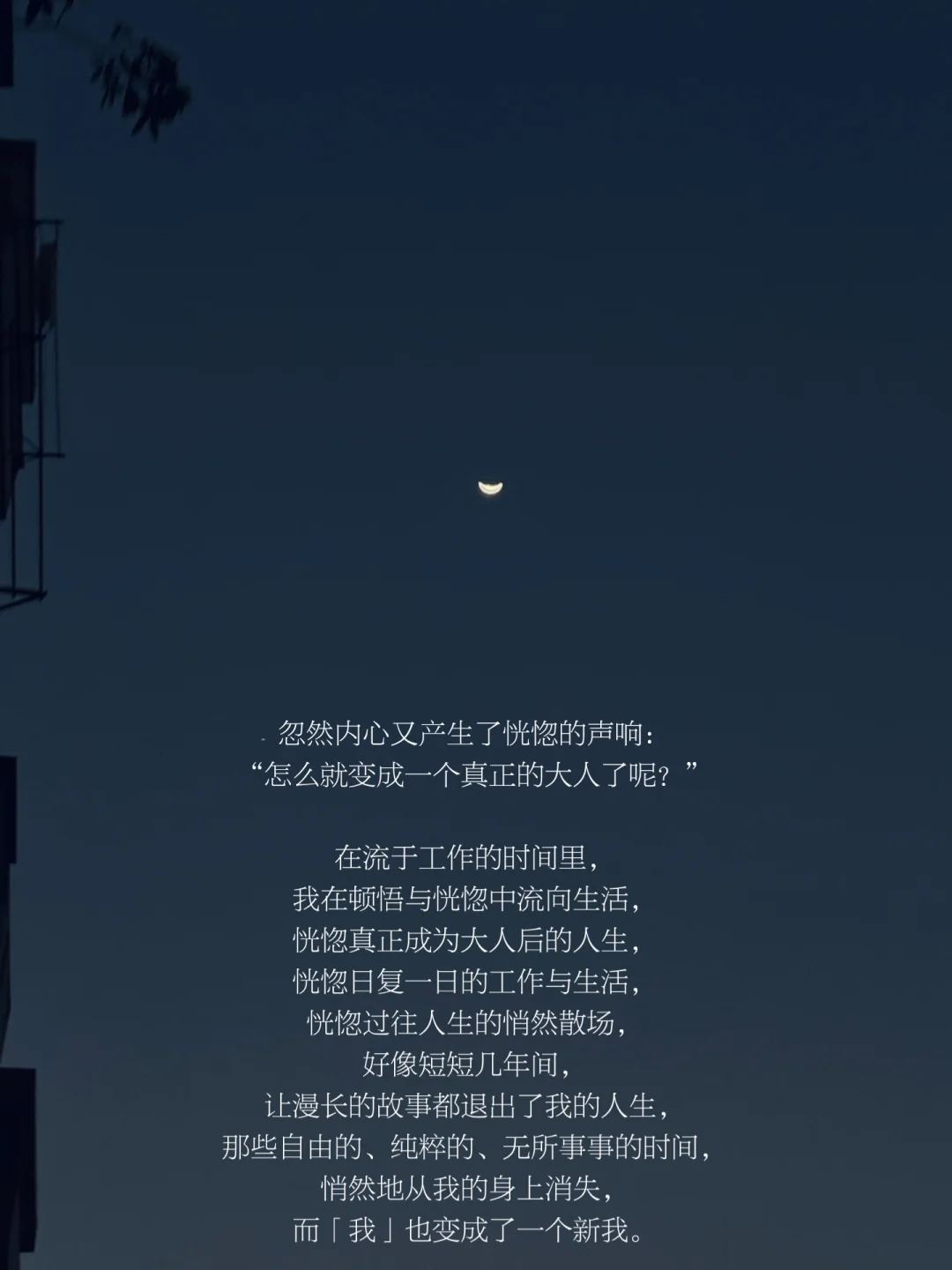 在流于工作的时间里,我在顿悟与恍惚中流向生活,恍惚真正成为大人后的人生,恍惚日复一日的工作与生活,恍惚过往人生的悄然散场,好像短短几年间,让漫长的故事都退出了我的人生,自由、纯粹、无所事事的时间悄然消失,而「我」也变成了一个新我。