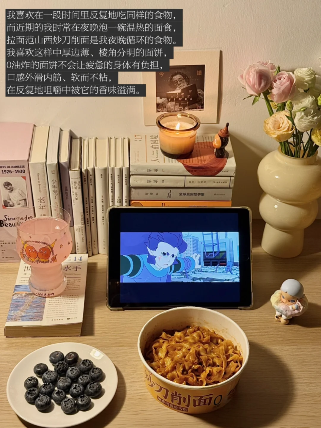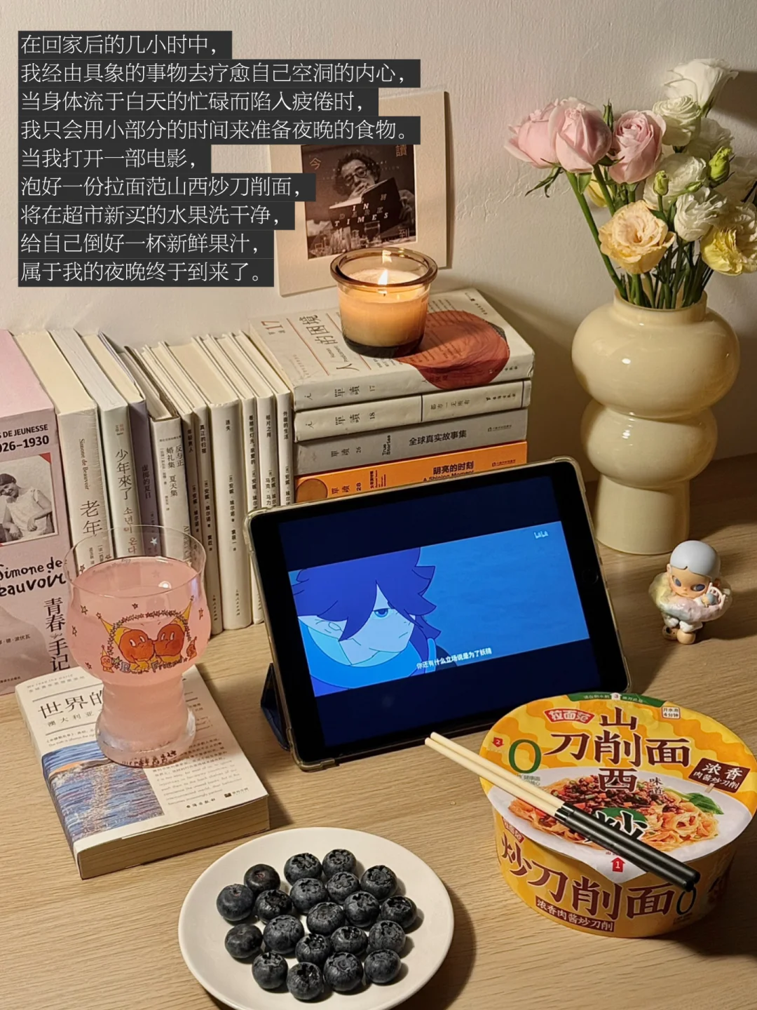 当身体因忙碌而陷入疲倦时,我只会用小部分的时间来准备夜晚的食物。我打开一部电影,泡好一份拉面范山西炒刀削面,将在超市新买的水果洗干净,给自己倒好一杯新鲜果汁,属于我的夜晚终于到来了。