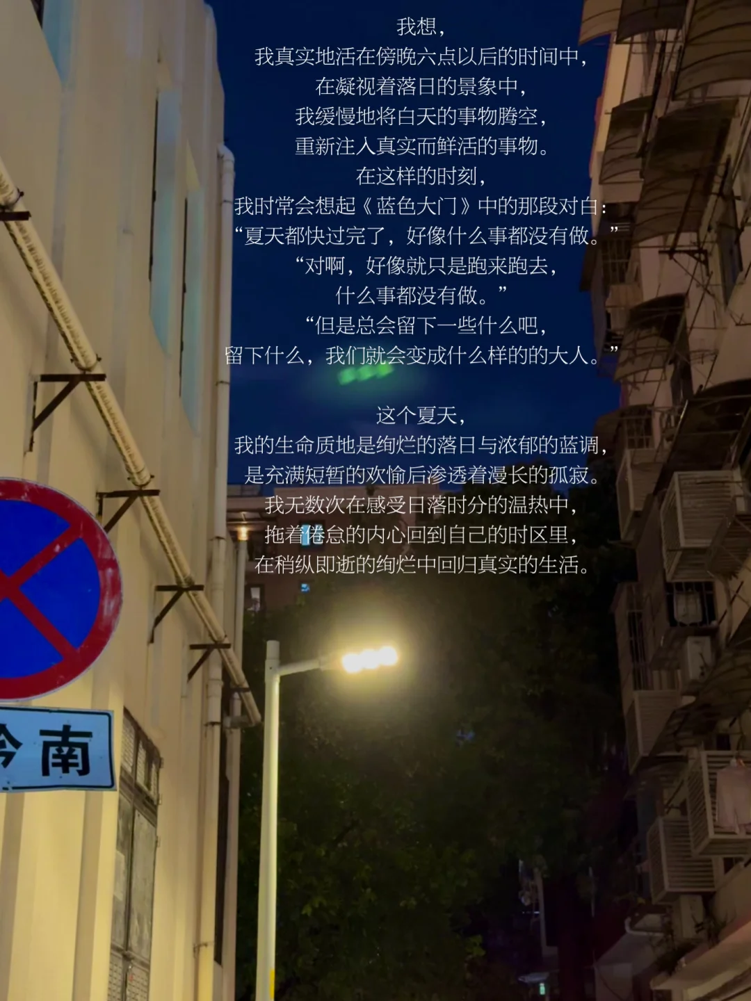我想,我活在傍晚六点以后的时间,在凝视落日时,缓慢将白天的事物腾空,重新注入真实而鲜活的事物。这个夏天,我的生命质地是绚烂的落日与浓郁的蓝调,是充满短暂的欢愉后渗透着漫长的孤寂。我无数次在感受日落时分的温热中,拖着倦怠的内心回到自己的时区里,在稍纵即逝的绚烂中回归真实的生活。