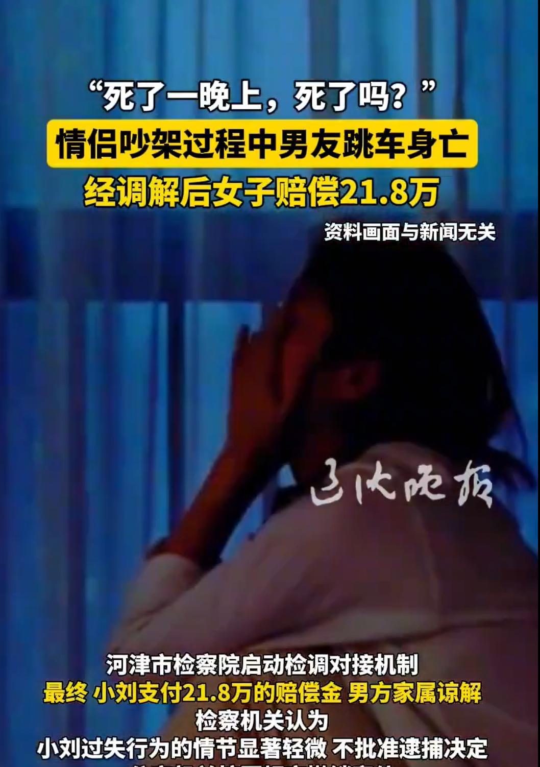 山西河津,一男子酒后致电女友,表露轻生念头,女友连夜从运城驱车赶回,在车内耐心安抚。然而,男子压根听不进去,二人发生争吵,激动之下,女友脱口而出:“你死了一晚上,死了吗?”话音未落,男子猛然拉开车门纵身跳下,重伤后,经抢救无效身亡。案发后,公安机关以涉嫌过失致人死亡罪对女友立案侦查,案件移送检察院后,女友积极赔偿男方家属21.8万元并取得谅解,终于迎来转机。 据光明网8月28日报道,刘小雅(化名)和小李(化名)是一对普通情侣,像许多年轻人一样,有着甜蜜的时光,也难免争吵拌嘴。 然而,谁也没想到,一次看似平常的争吵,竟会以如此惨烈的方式,给两个家庭带来无尽的伤痛。 2024年4月的一个夜晚,在运城市工作的刘小雅接到了男友小李打来的电话。 电话那头的小李声音含糊,情绪极其低落,明显是喝了酒,他在电话中向刘小雅倾诉生活的种种不如意,甚至多次表露出“不想活了”、“活着太累”之类的轻生念头。 刘小雅听到后心急如焚,尽管夜色已深,她还是立刻驱车,从运城市连夜赶回了河津市,希望能安抚男友的情绪。 接到小李后,为了有一个相对私密的空间沟通,刘小雅让小李上了她的车,并尽力安慰着男友,耐心开导他。 但深陷情绪漩涡的小李似乎什么也听不进去,酒精放大了他的悲观和绝望,两人的交流逐渐从安慰变成了争执,气氛越来越紧张。 在激烈的争吵中,情绪失控的刘小雅对着不断说要“去死”的小李,脱口而出了一句气话:“你死了一晚上,死了吗?” 她万万没想到,这句在情绪顶点说出的、本意或许是冲动和无奈的话,成了压垮小李的最后一根稻草。 话音刚落,坐在副驾驶的小李竟猛地拉开车门,纵身跳了出去! 刘小雅被这突如其来的举动惊呆了,她立刻紧急刹车,冲向摔在路边的小李。 然而,小李伤势严重,被迅速送往医院抢救,在重症监护室里,整整一周后,最终因伤势过重,不幸离世。 小李的离世,给他的家人带来了毁灭性的打击。 而刘小雅,也从一名担忧男友的女友,瞬间变成了与男友死亡有关联的嫌疑人。 案发后,当地公安机关依法介入,以刘小雅涉嫌“过失致人死亡罪”立案侦查,并随后向检察机关提请批准逮捕刘小雅。 案件移送到检察院后,刘小雅的行为究竟是否构成犯罪?如果构成,其情节如何?成为案件一个难点。 为了彻底化解矛盾,实现案结事了人和,检察院组织相关人员对双方进行了调解,最终促成了双方达成一致,刘小雅一家东拼西凑,一次性向小李家属支付了赔偿金共计21.8万元人民币。 小李的家属在收到赔偿款后,出具了书面的《谅解书》,对刘小雅的行为表示了谅解。 那么,检察院对刘小雅的行为到底会如何认定呢? 《刑法》第二百三十三条的规定,过失致人死亡的,处三年以上七年以下有期徒刑;情节较轻的,处三年以下有期徒刑。 在法律上,构成此罪,主观上必须要求行为人存在“过失”,包括“疏忽大意的过失”即应当预见自己的行为可能发生危害社会的结果、因为疏忽大意而没有预见,以及“过于自信的过失”即已经预见而轻信能够避免。 同时,还得客观上要求行为人实施了致人死亡的行为,且该行为与死亡结果之间存在刑法上的因果关系。 本案中,刘小雅一方面在深夜驾车接回酒后情绪不稳的男友并进行安抚和争吵,另一方面,在争吵过程中说出了那句刺激性的话语。 小李的死亡直接原因是其自行跳车导致的严重损伤,刘小雅的言语刺激与小李的跳车行为之间存在一定的条件关系,但这种关系是否构成法律上的、直接的、必然的因果关系,是本案定性的关键。 小李作为完全民事行为能力人,应当明知在行驶的车辆中跳下的极端危险性,其跳车是基于自身意志的决定。 因此,刘小雅的那句话是诱因,而非导致死亡的决定性原因。 但是,在主观层面,刘小雅能否“预见”到自己的气话会直接导致男友跳车?这在实践中很难证明,情侣间的争吵用语往往带有情绪化色彩,虽然“死了一晚上,死了吗”这句话极具刺激性,但在特定情境下,将其认定为刑法上“应当预见”会发生死亡结果的行为,显得过于严苛。 更可能的是,刘小雅在当时情境下,未能预料到男友会采取如此极端且即时的手段,其过错更偏向于道德或普通注意义务的层面,而非刑法所要求的“过失”。 《刑事诉讼法》第十六条规定,有下列情形之一的,不追究刑事责任,已经追究的,应当撤销案件,或者不起诉,或者终止审理,或者宣告无罪:(一)情节显著轻微、危害不大,不认为是犯罪的…… 关键是,刘小雅事后积极赔偿家属并获得谅解,修复了社会关系,社会危害性已大大降低。 最终,检察院认定刘小雅的行为“情节显著轻微”,作出不批准逮捕决定,并最终由公安机关撤案。 对于本案,大家有什么想说的呢?#分享城市新鲜事# 欢迎关注@洋仔说法留言讨论!