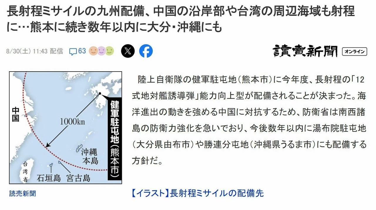日本九州岛开始部署12式反舰导弹 日本共同社近日报道,日本防卫省计划在2025年末前,在熊本的陆自健军驻地部署改进型12式陆基反舰导弹,作为应对中国在琉球群岛周边日益增强的军事压力的一项重要措施。 改进型12式陆基反舰导弹,虽然名为“改进型”,但它实质上是一款中程陆基导弹,其射程远远超过原本的88式岸舰导弹。改进型12式的射程已大幅提升至1000公里,能够覆盖中国东南沿海的海域(能攻击到上海啦!),进一步增强了日本自卫队在更远距离上对海上目标的打击能力。 尽管改进型12式导弹采用了六边形弹体设计和吸波涂层,雷达反射截面仅为0.01到0.1平方米,具有一定的隐身能力,但中国已经部署了先进的米波反隐身雷达,如JY-27A,以及空警-500预警机,极大提升了对隐身目标的探测能力。 而且,改进型12式毕竟还是一款亚音速导弹,尽管具备一定的突防能力,但在面对天基红外预警卫星的协同作用下,导弹的发射初期便可能被锁定并拦截。 #反舰弹道导弹# #日本弹道导弹# #反舰导弹演练#
