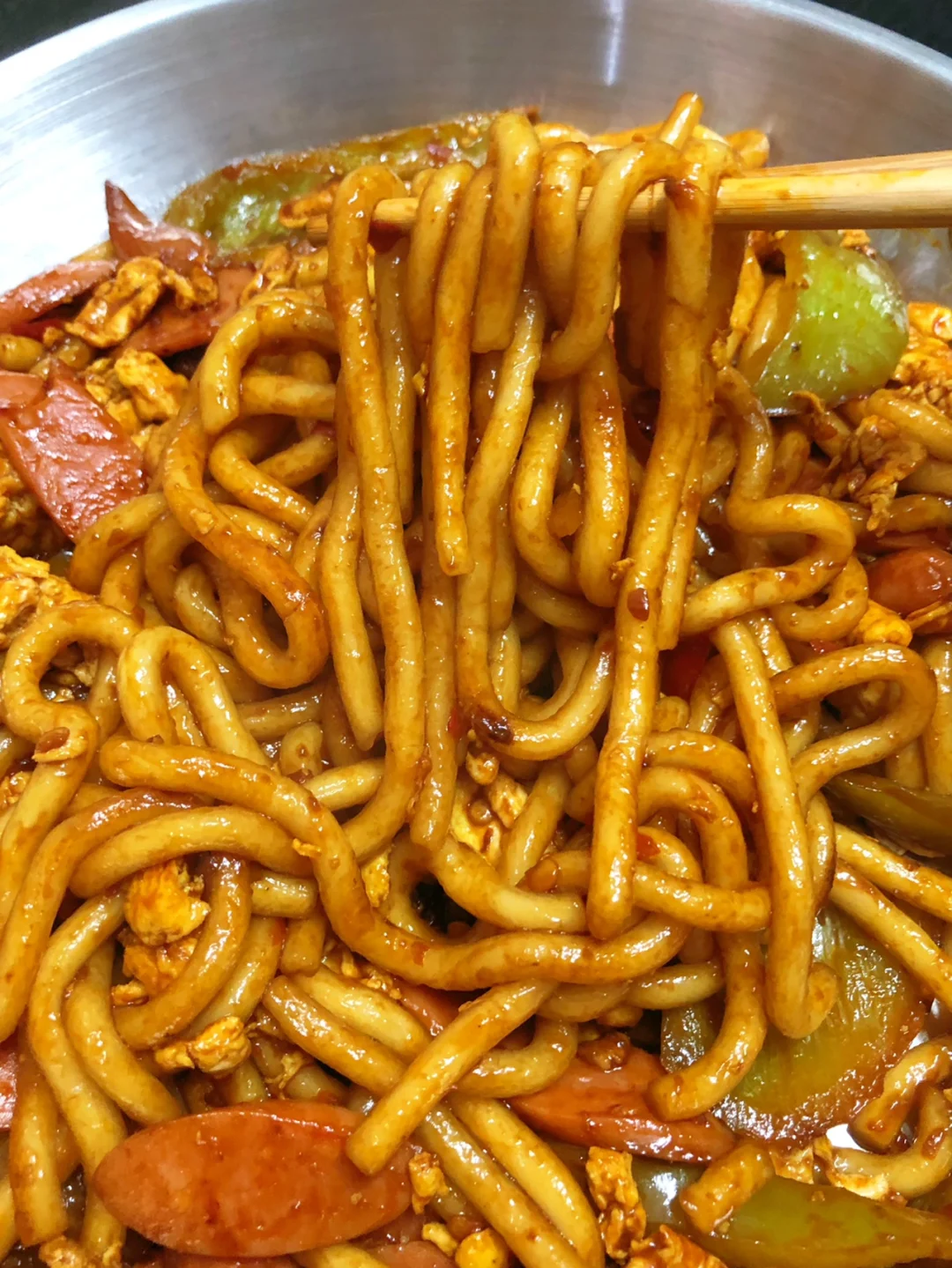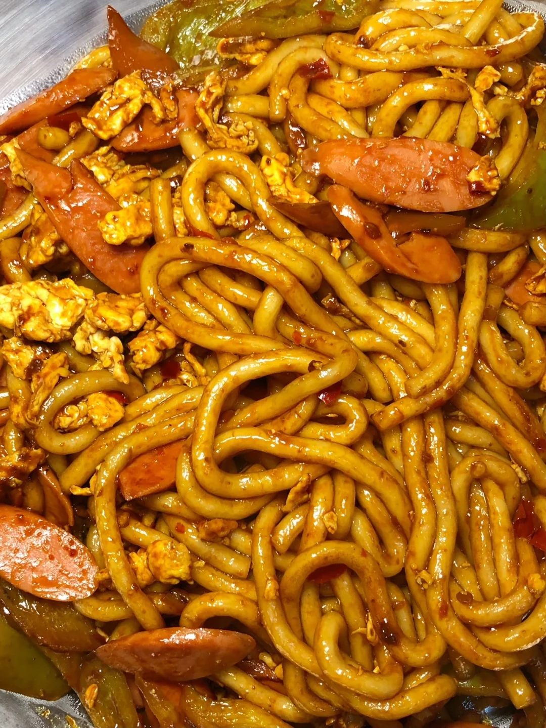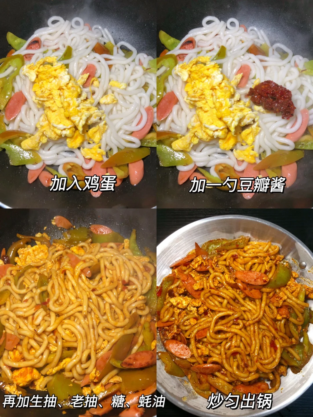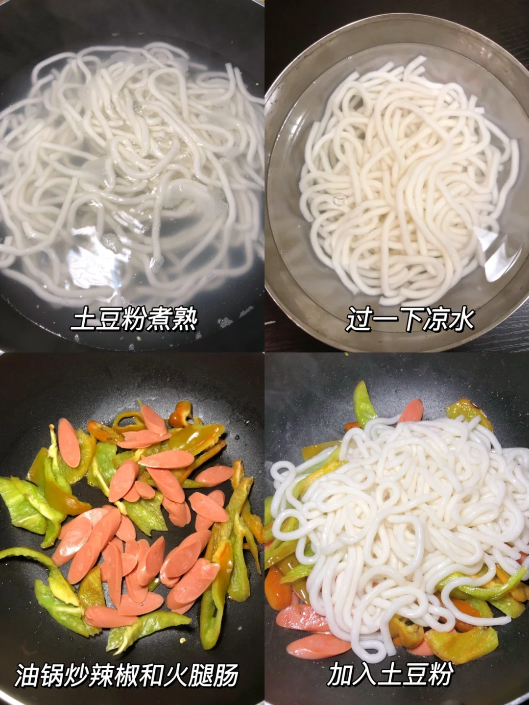 土豆粉这么做真的好绝! 太香啦!!! 而且很快手,适合懒人姐妹!! 1⃣️鸡蛋炒熟备用,土豆粉煮熟捞出过一下冷水沥干水分 2⃣️油锅加入辣椒和火腿肠翻炒,再加入土豆粉、鸡蛋炒匀,加一勺豆瓣酱、一勺生抽、一勺老抽、一勺蚝油、一勺白糖炒匀之后出锅 完成✅ 跟路边摊的感觉差不多啦!!